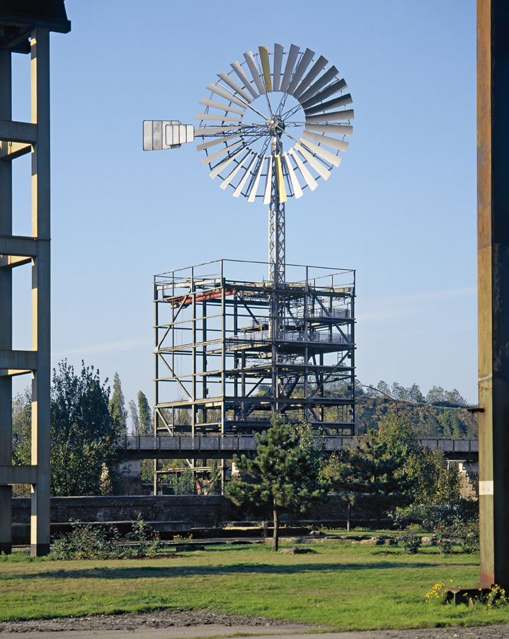 Existing profiles and constructions were used to create an ecological clean water system: The open waste water canal of the “Old Emscher”, crossing the park from east to west, was transformed into a clear water canal with bridges and footpaths, exclusively fed by the clear rainwater. The waste water is now carried within a 3.5m diameter underground main. It is sealed by a layer of clay which collects run off from the buildings, bunkers and former cooling ponds. A windpower installation was set up in the mill tower of the former sintering plant to ensure the cleaning and the transport of the water.