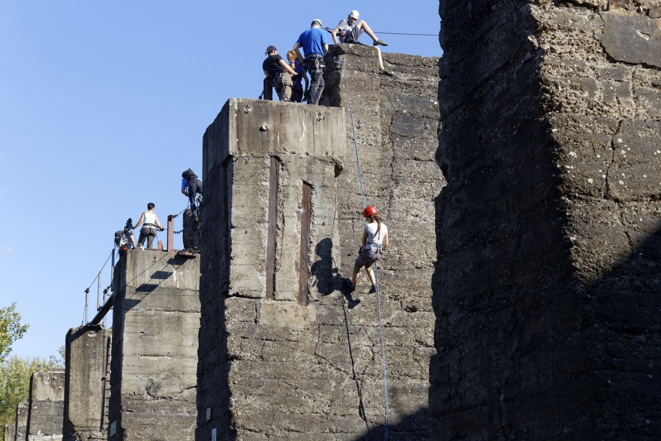All the mineral surfaces, lawns, meadows and gardens can be used throughout the park; the bridges and partially accessible industrial buildings and ruins are open to everyone and offer a large, safe playground in a dramatic environment.