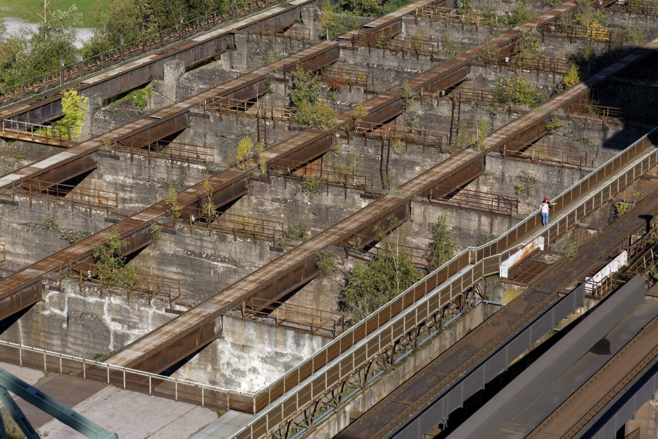 ▼景观步道横跨于矿仓之间。游人可以穿梭其间,俯视脚下12m深的水泥隔 间。The walkway between the charge bunkers and the ore bunkers provides views into the 12-metre deep concrete compartments from above. © Michael Latz
