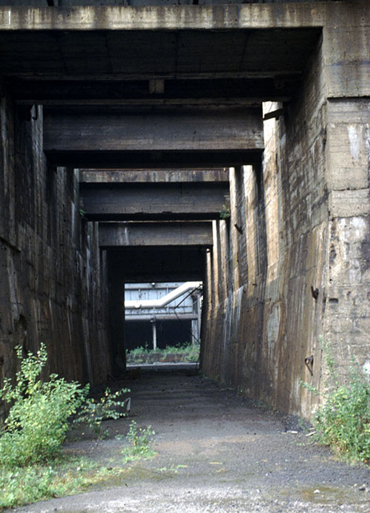 ▼铁轨高架桥穿梭于矿仓的水泥隔间之间。 Railway bridges cross the com- partments of the bunker site. © Michael Latz