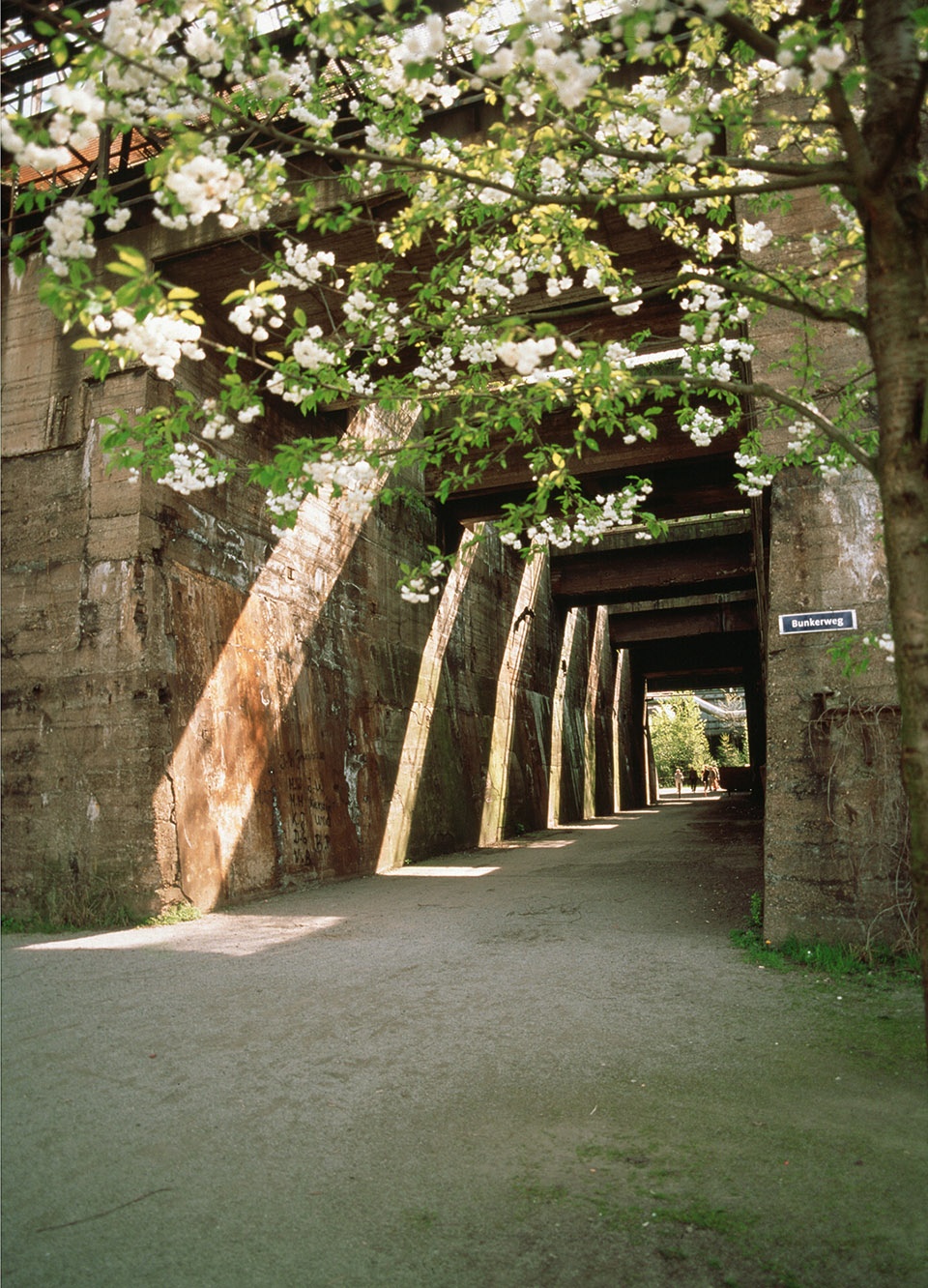The place of the former sintering plant was heavily contaminated and had to be almost completely demolished. Today it is a flourishing meadow and a shady grove, a huge festival place, framed to the side of the blast furnace plant by the remainders of the former overhead railway and a high level walk. With a length of 300m it leads across the bunkers and gives views down into the gardens built at various heights and depths within the bunker site.