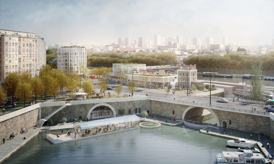 The second, located on the axis of Bastille, is dedicated to public activities. It maintains a lower profile, opening up views to the Seine River. This part of the site includes three new public squares, a lockhouse built in 1905 that is being repurposed, and a temporary pavilion that will host facilities like public co-working spaces, a fabrication lab, an event room, and an exterior terrace offering new views on the Arsenal Basin, the Seine River, and the surrounding city, as well as a facility for homeless care already established on site.