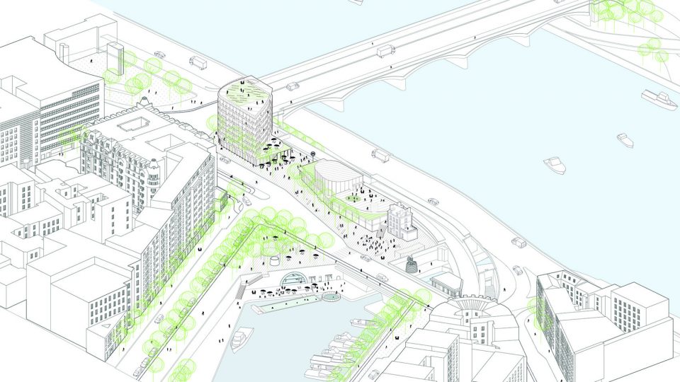 ▼基地被分为两部分,一部分高度上和历史建筑相呼应,另一部分面向河景开放,site divided into two parts, one responding to the historical buildings in height and the other provides open views to the rivers