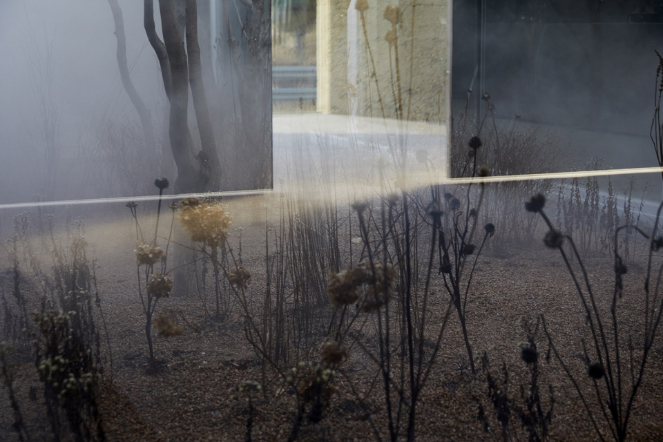 The surface of the wall works as a back of the chair and customers can see the courtyard is in the middle. This wall is slightly leaned backwards to help customers gaze the plants in the courtyard, the sky and the fog. Customers can face themselves while gazing this view. Different images of plants and sky as time and season change is a metaphor for cycle of life.