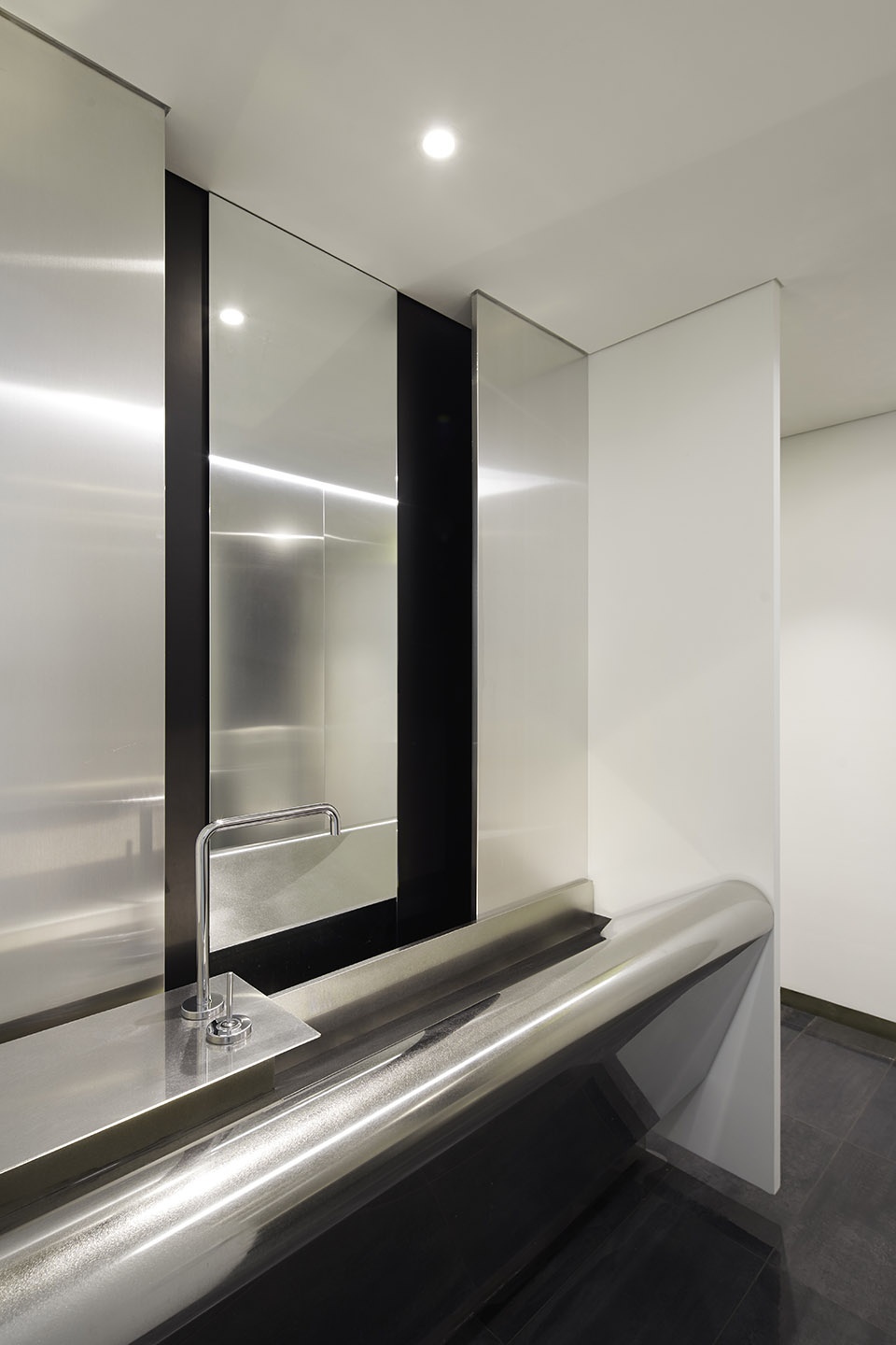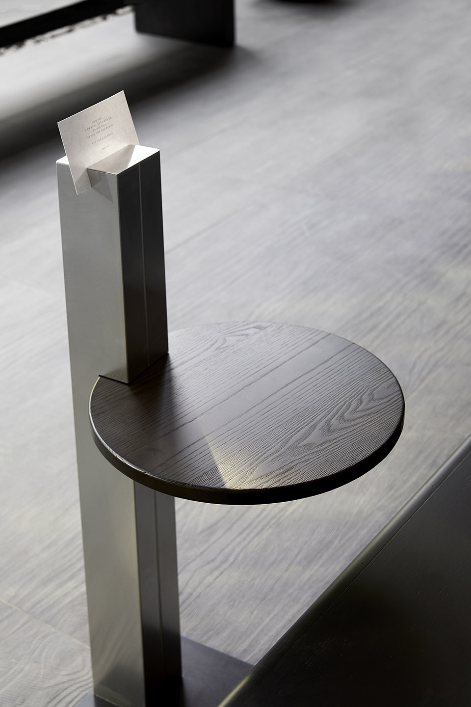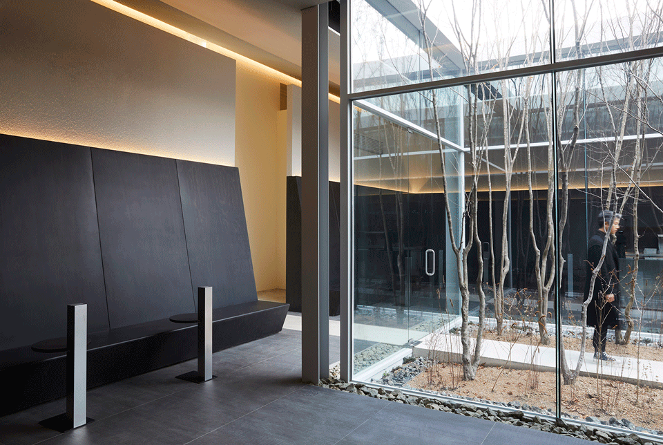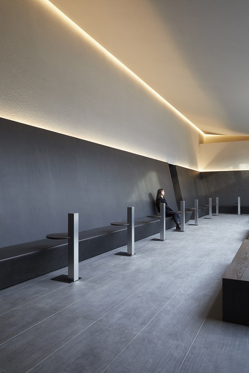 墙的表面同时也是椅背,顾客坐在这里可以看到位于项目中部的庭院。墙面微微向后倾斜,促使人们把注意力集中在庭院里的植物、天空和雾气上,从而直面自己的内心。植物与天空随时间和季节变化形成不同的景象,暗示着生命的不断循环。