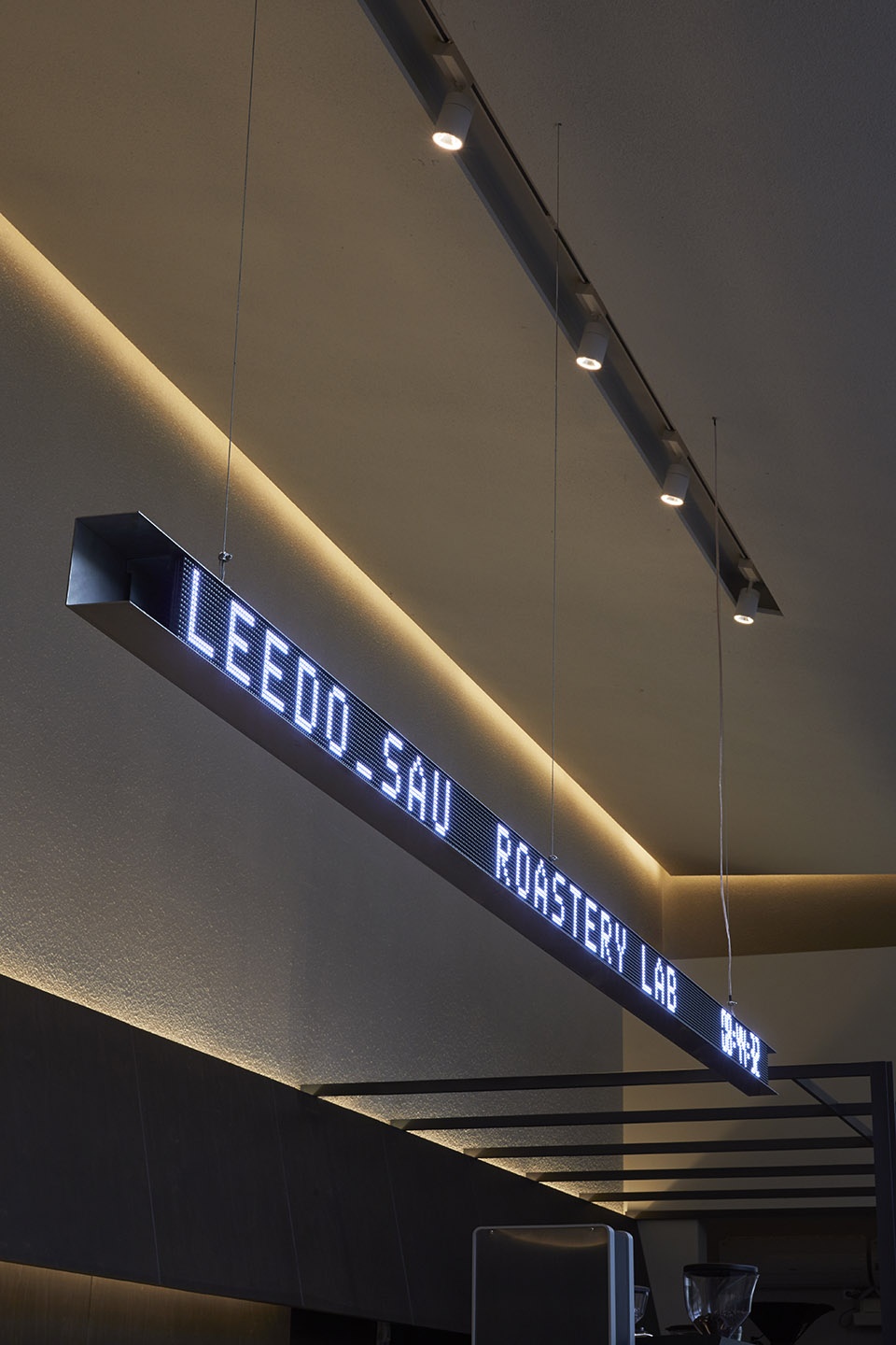 庭院对面的LED屏幕帮助顾客找到咖啡吧的位置,右侧为一个时钟,告诉顾客现在的时间。项目展示了时间的流逝与生命的循环,这里的时间与外部世界同步。现代的LED屏幕与咖啡厅的环境形成鲜明对比,创造出迥异的空间感受。
