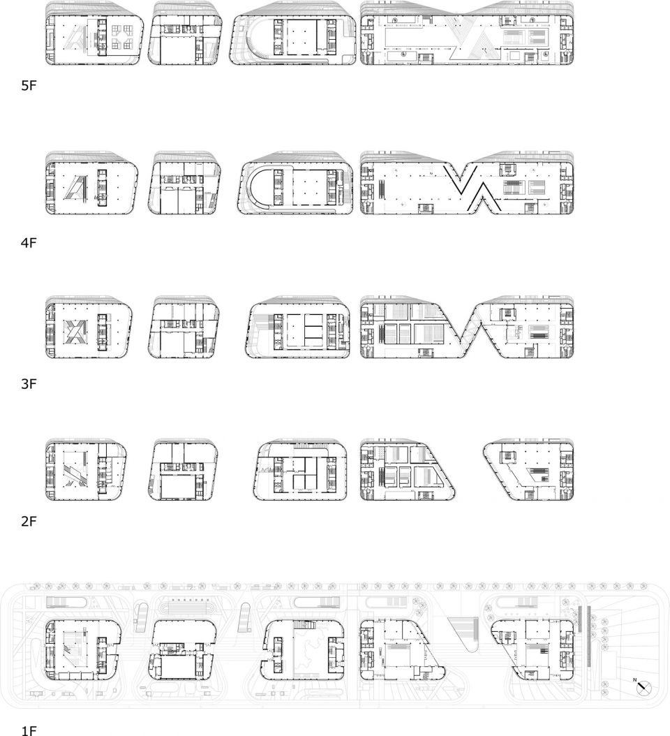 建筑位于一块3.8公顷的狭长场地中并且具有严格的高度限制。设计方案通过将建筑划分为单独的体量来建立与周围区域的联系。体量之间的通道与相邻道路相连,提供了从建筑西侧新商业区到达东侧公园的通道。弧线与倾斜立面形成了动态视角、荫蔽的公共广场和自然而然的人流导向。在深圳亚热带气候环境中,这种流线形态还可以引导气流、遮阳和避雨。建筑体量都采用同样的设计语言、高度和材质,形成了一个视觉上连贯的整体,没有明显的正面或背面之分。