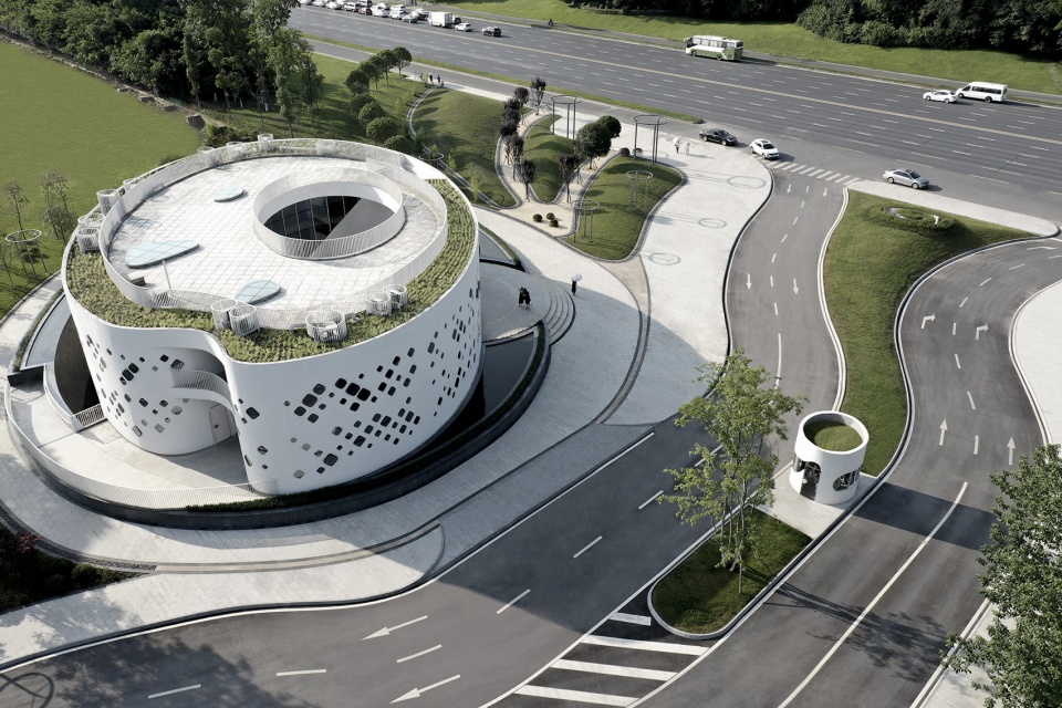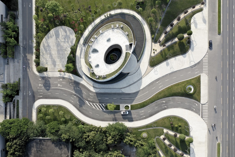 On the main entrance square of Chenglong Avenue, a series of hills are standing there, like the outstretched hands to streamline the cars. The ups and downs of the terrain filters the noise on the roads and the winding lane restricts the traffic speed, converting it into a joyful visit. The masterplanning of the pedestrian is considered with the separation of the vehicles, so the parking lot is on the lower ground and the design of the pedestrians extended from the large ladders along the landscapes to the inner space.