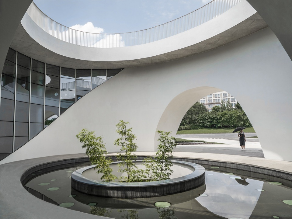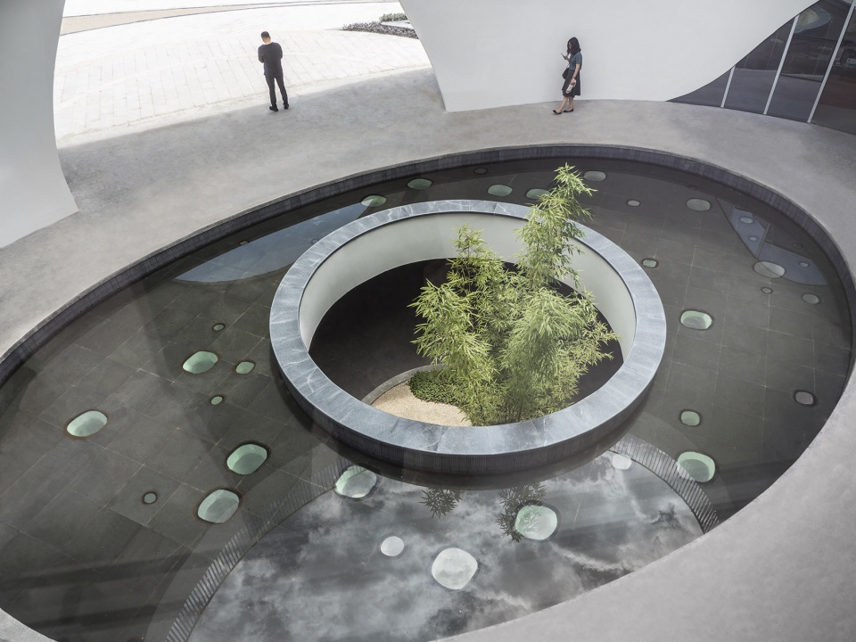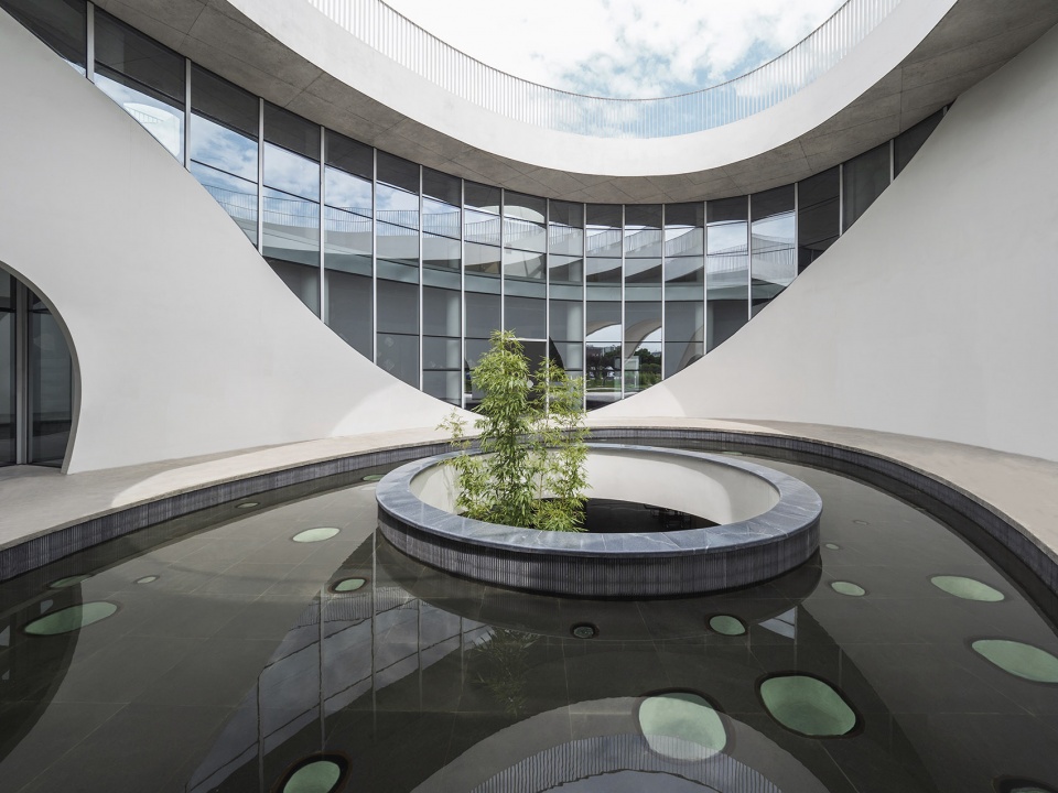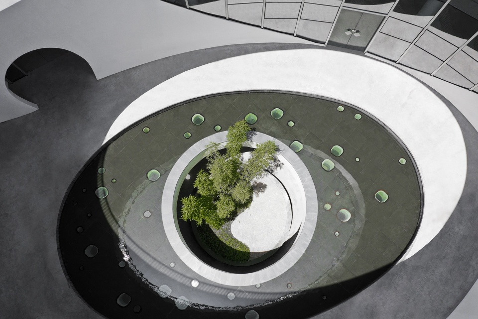 Not far from the entrance, you will first see a small building with white facade is , with drop-shaped windows arranged organically and twinkled under the sunlight. The half-moon pool forms a waterfall from top to bottom, and the sound of water washes the noise of the past. The semi-circle gate and the circular platform echo from top to bottom, forming a metaphor of moon mirroring in the water. Arriving at the inner atrium through the door opening, a large oval pool appears, where the skylight is reflected from the water surface to the surrounding curved glass windows, leaving an unfilled scene on the white wall. The revealing round hole in the pool is connected with the underground to form an atrium, to leave the green bamboo slightly appears. Light penetrates through the leaves and the diamond-shaped glass on the bottom, along with the light wave points dancing in the shadows of the trees below, forming a wonderful water-light concerto. The hollow part of the white building is reserved for the sky and earth, which reproduces the mysterious realm with the changes of light and shadow.