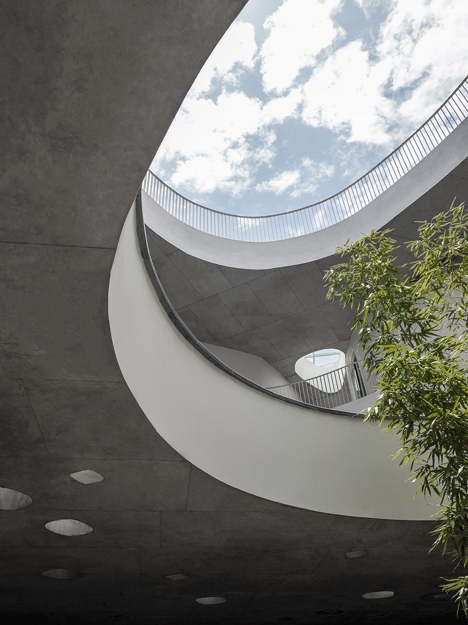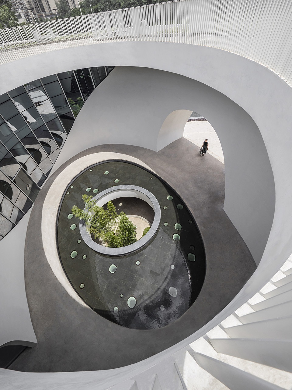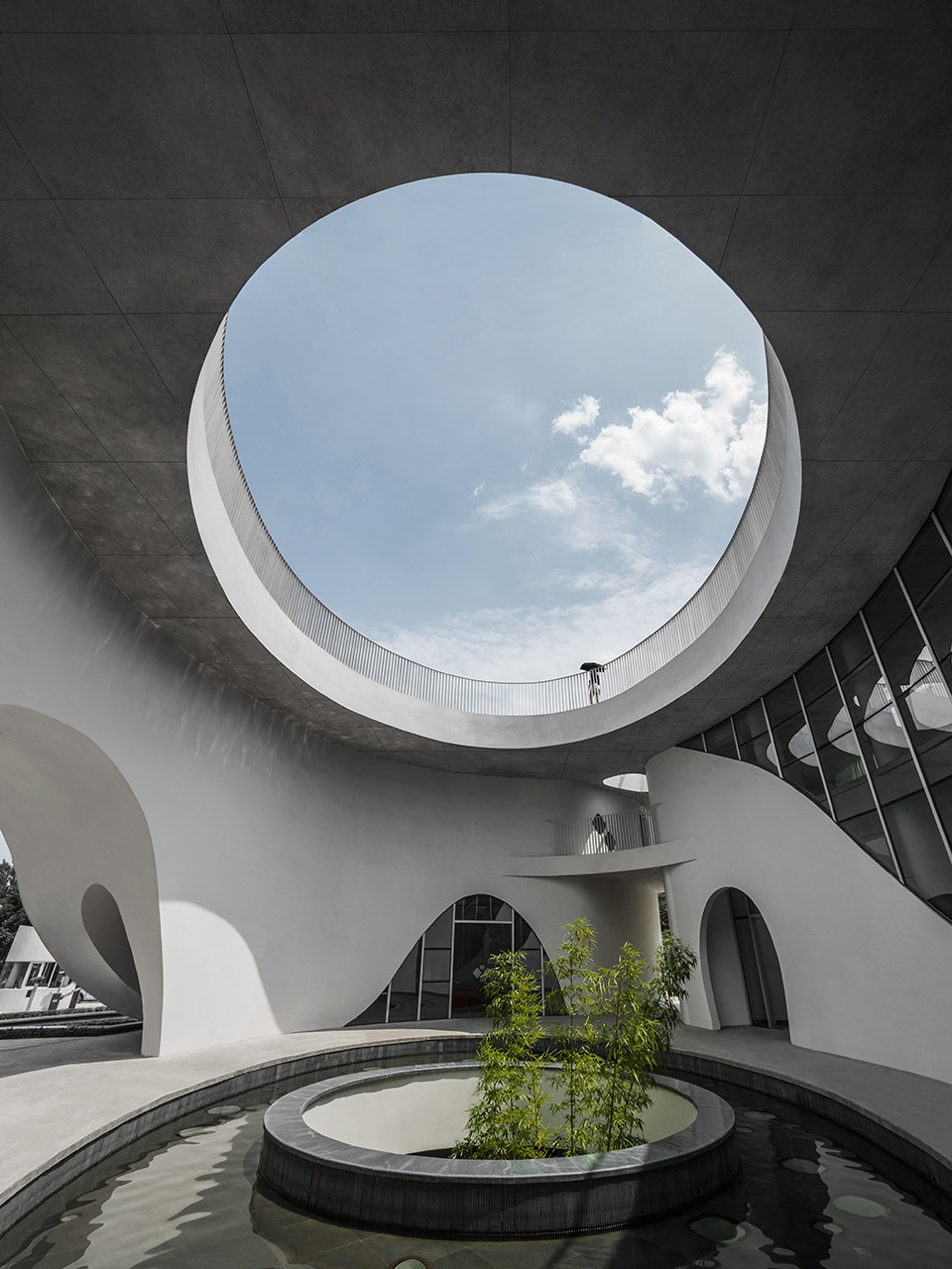 Not far from the entrance, you will first see a small building with white facade is , with drop-shaped windows arranged organically and twinkled under the sunlight. The half-moon pool forms a waterfall from top to bottom, and the sound of water washes the noise of the past. The semi-circle gate and the circular platform echo from top to bottom, forming a metaphor of moon mirroring in the water. Arriving at the inner atrium through the door opening, a large oval pool appears, where the skylight is reflected from the water surface to the surrounding curved glass windows, leaving an unfilled scene on the white wall. The revealing round hole in the pool is connected with the underground to form an atrium, to leave the green bamboo slightly appears. Light penetrates through the leaves and the diamond-shaped glass on the bottom, along with the light wave points dancing in the shadows of the trees below, forming a wonderful water-light concerto. The hollow part of the white building is reserved for the sky and earth, which reproduces the mysterious realm with the changes of light and shadow.
