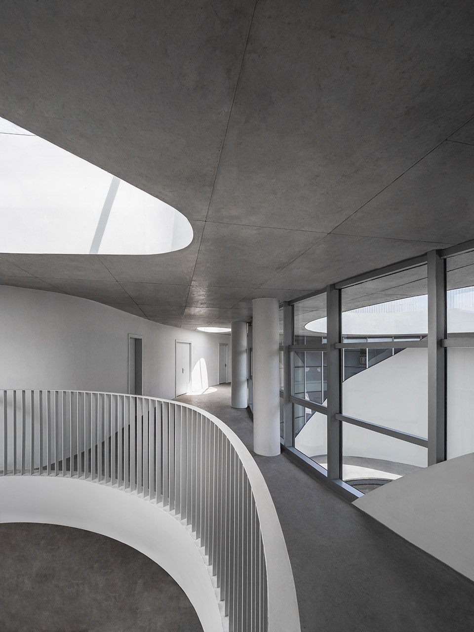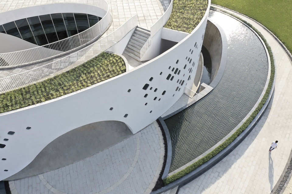 The surrounding space integrates leisure, exhibition, conference, reception, office, diet, etc. together to create an intimate and friendly feeling. The facade endows its water temperament, enable the light to present vibrantly on the clean white wall. The external window was designed horizontally to adjust the light and temperature. The concrete structured space blurs the boundaries of the atrium under the partition of large floor-to-ceiling windows. The upper ceiling curved holes formed naturally with the water shaped drops by the skylight that penetrates from the outside to the inside. Green energy was considered in the design as it collects the rainwater to the pool and cooling the building temperature. On the one hand, the white building has established a dialogue with its historical background; on the other hand, as a community in the incubation park, attracting people to visit. The nature power represents architecture, and finally becomes a symbol to share with others.