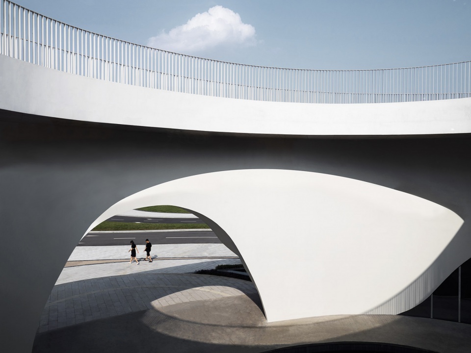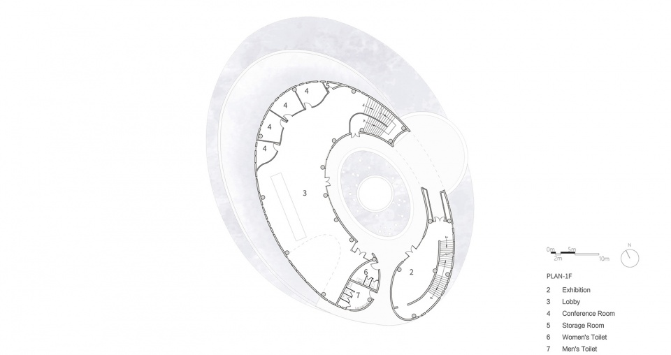 文化中心以一种富有生命力的地景角度切入,纯粹的椭圆体转动构成的动感涟漪纹理,为环形建筑的动线原型。借由圆圈的生成,构成多层次的空间逻辑,达到一种互为表里的空间体验。人们在此自由进出,由弧形的拱墙和精致的天窗,感受通透和轻盈的品质。