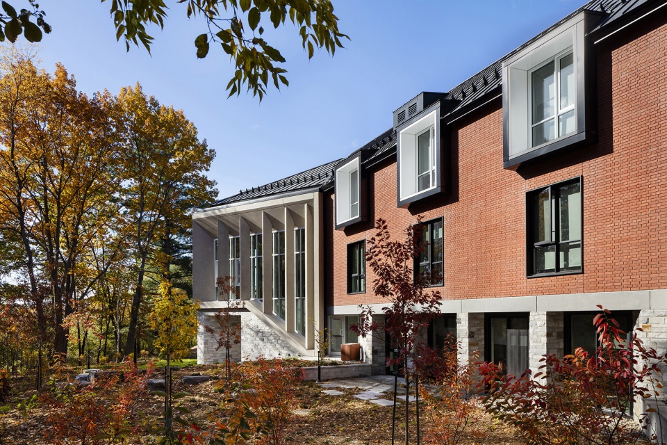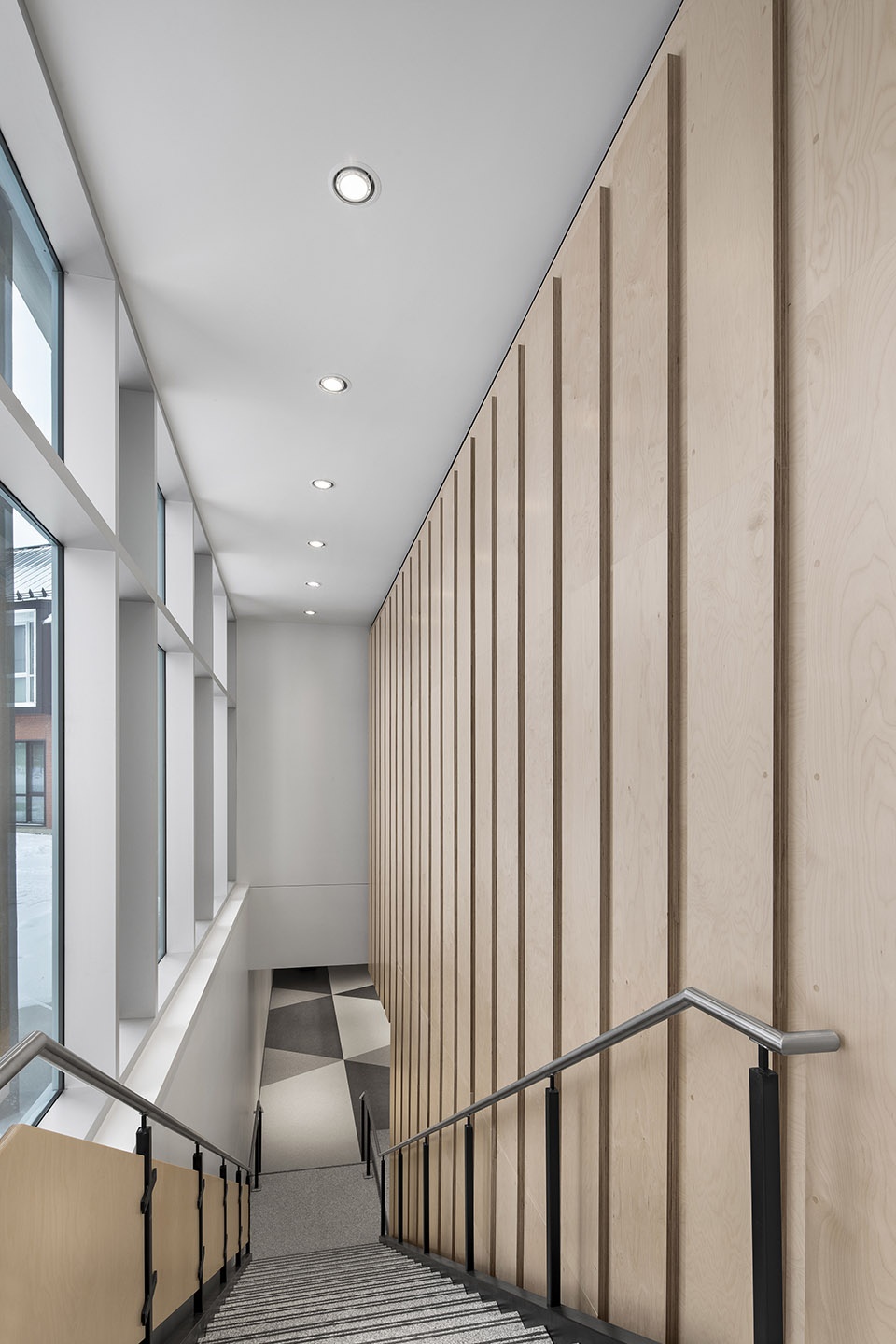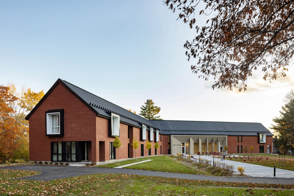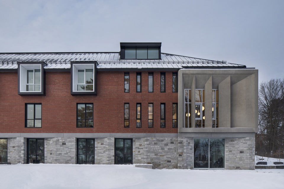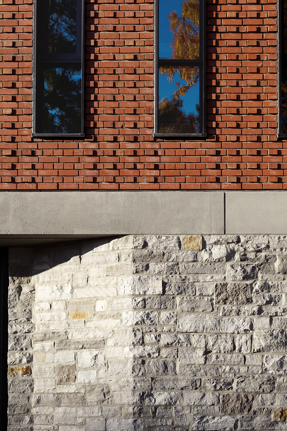 本项目致力于在展现自身特性的同时,与校园中现有建筑的风格、规模和材料色调保持一致。最终,设计团队选择砖作为立面的材料,一方面确保了建筑环境的连续性,另一方面也呼应了校园周边Lennoxville小镇悠久的制砖历史。室内空间采用木制饰面,为两个入口区域、楼梯间和社交空间等平添了些许暖意。