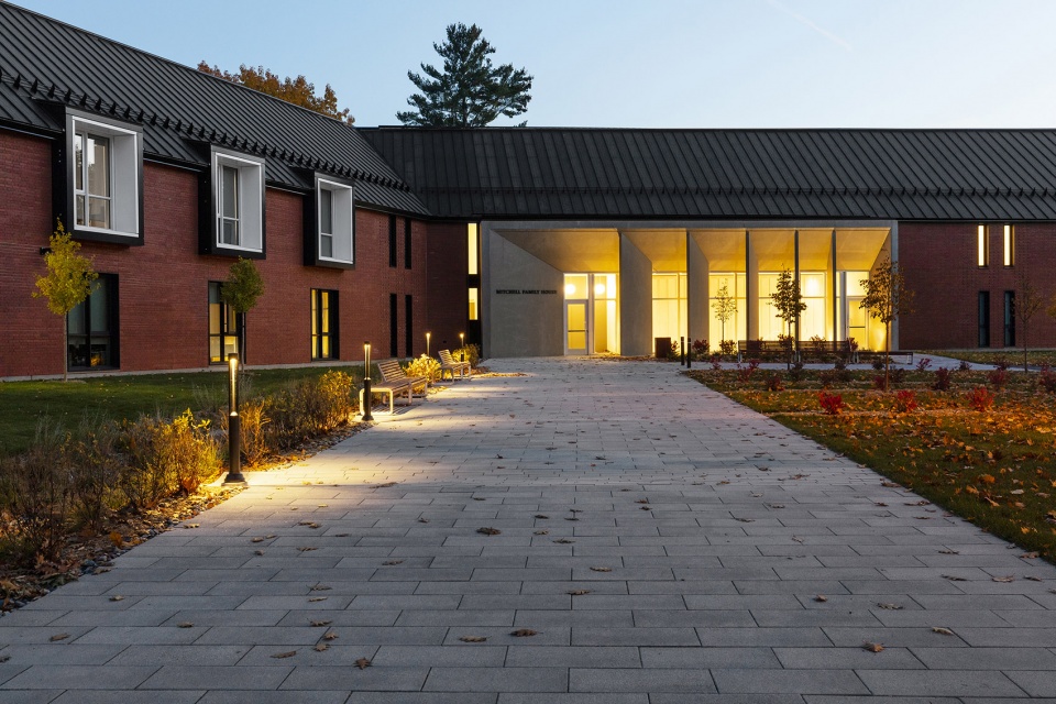 The construction of an eighth residence for students, the first to include both residential and academic components, was an unprecedented response to BCS’s interest in bringing together multiple aspects of the student experience. The new building, named Mitchell Family House, faces the existing campus while establishing a close connection to the surrounding forest and nearby river.