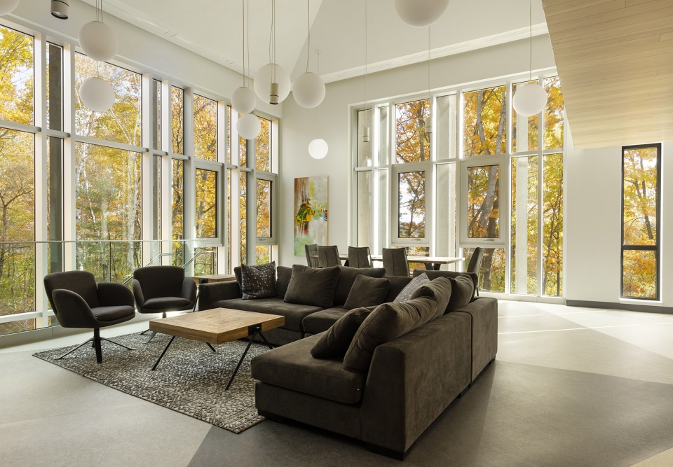 The architects’ intention was to reduce the building’s carbon footprint to a minimum. Highly efficient mechanical systems and triple glazed windows were among the means used as well as prefabricated wall panels insulated from the outside. The residence was connected to the campus’ central geothermal system. Four new wells were drilled on site to respond to the building’s heating and cooling requirements. In addition, a heat recovery system was introduced to pre-heat incoming fresh air during the winter. This air is subsequently brought to required temperatures in part by geothermal water to air heat pumps.