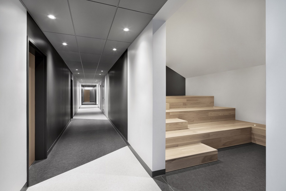 The carefully planned circulation was key to the implementation of the hybrid concept. The main challenge was to ensure the privacy and security of the young residents while greeting occasional visitors warmly. The entrance area provides two separate access points, one leading to the private residential wings and one to the public common areas.