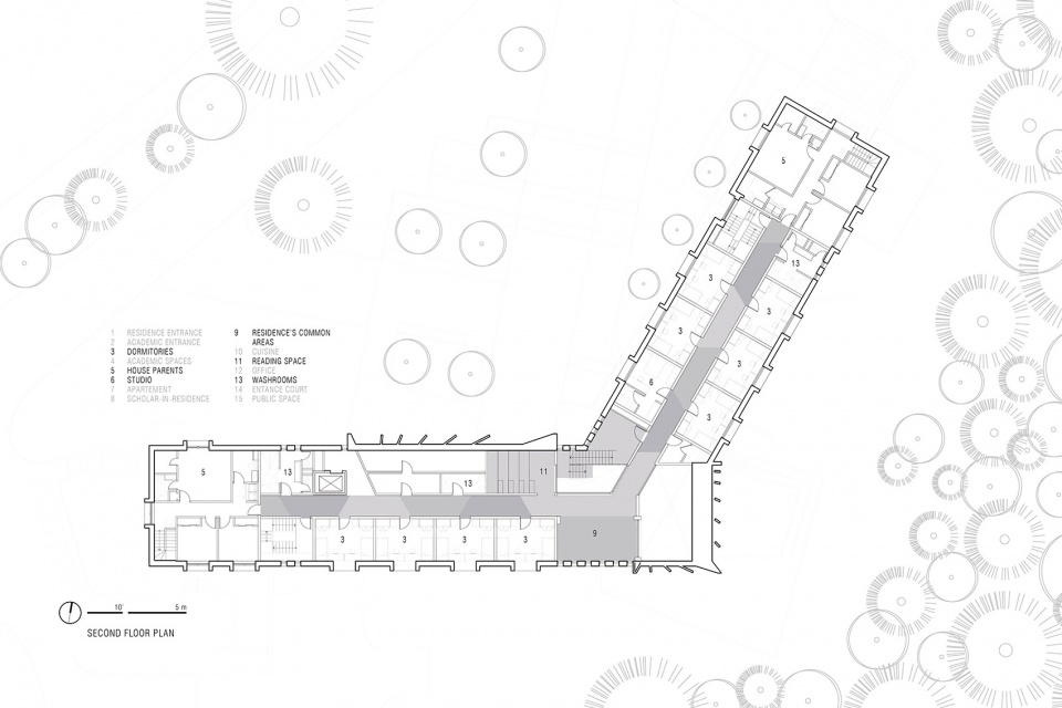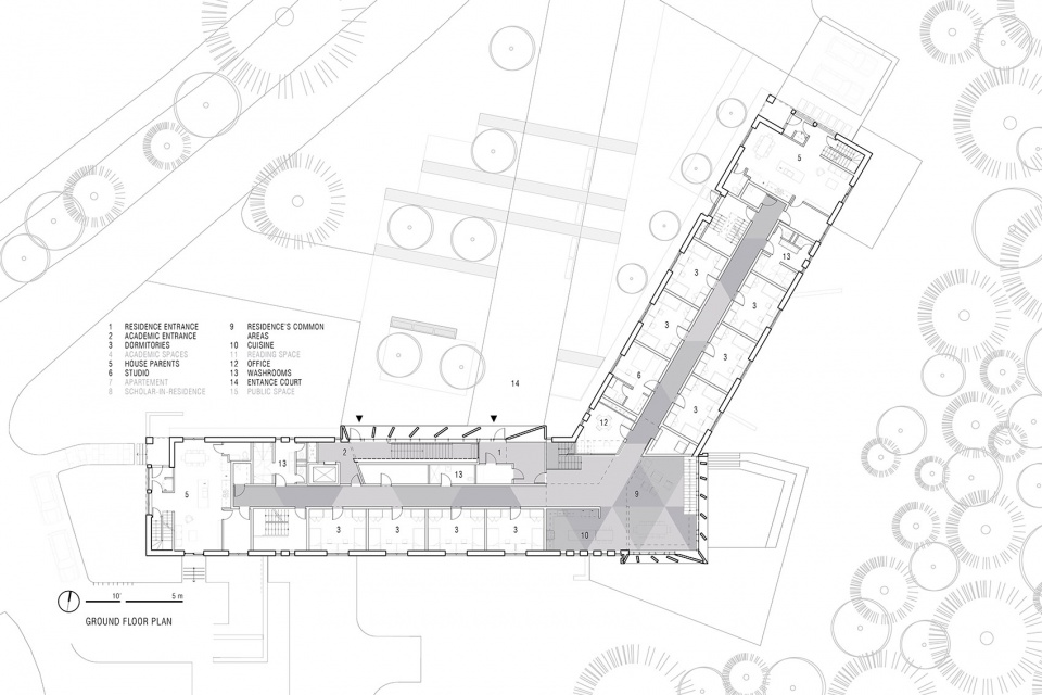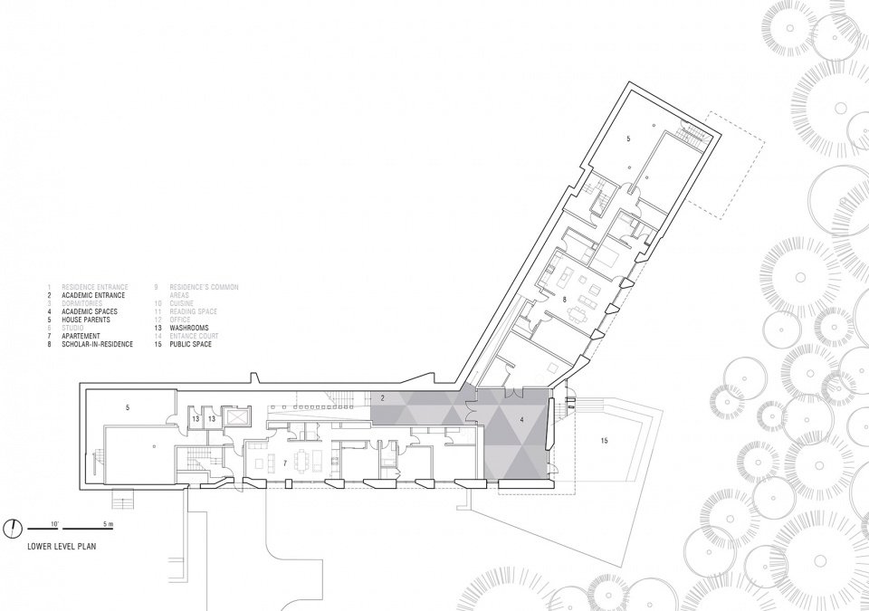 大楼的底层主要用于各种学术活动,容纳着各种多功能空间,其中还包括了一个供驻校学者使用的工作室兼办公室。首层可通向室外的广场。该广场不仅为学校师生提供了一个可以沉浸在自然环境中的场所,还为他们创造了一个可以举办小型活动的空间。夜幕降临的时候,公共区域的中心体量就仿佛一个巨型的灯笼,照亮了外部环境。