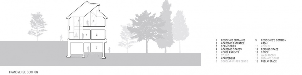 实际上,对于这种教学空间与居住空间相融、学生与教职人员混住的建筑来说,合理规划交通流线是十分必要的,因为必须要在保证学生的隐私和安全的前提下,满足偶尔出现的访客对功能空间的需求。最终,入口空间被分成了两个相互独立的区域,一个通向私人的居住空间,另一个则通向公共区域。