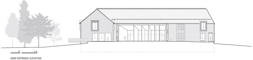 考虑到现场的状况,尤其是建筑的陡峭斜屋顶,设计团队特别注意了基地的水体管理。当雨水落到地面上的时候,它们会被地沟引向两个储水池,以免过量的雨水对周边的天然林地造成破坏。地表的径流也直接流向储水池,从而保护了河岸空间免受侵蚀。
