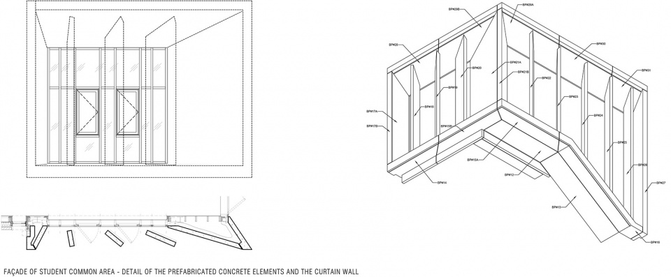 ▼学生公共空间立面及其预制混凝土墙板和玻璃幕墙细节,facade of student common area – details of the prefabricated concrete elements and the curtain wall ©ARCHITEM Wolff Shapiro Kuskowski architects