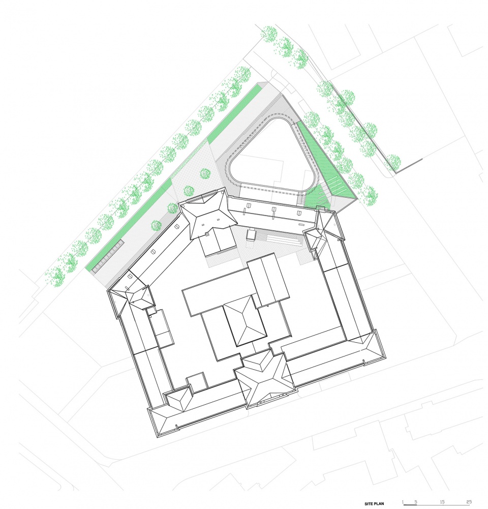 project plan, the lecture hall is located on a triangular plot in the northeast corner © Qarta architektura