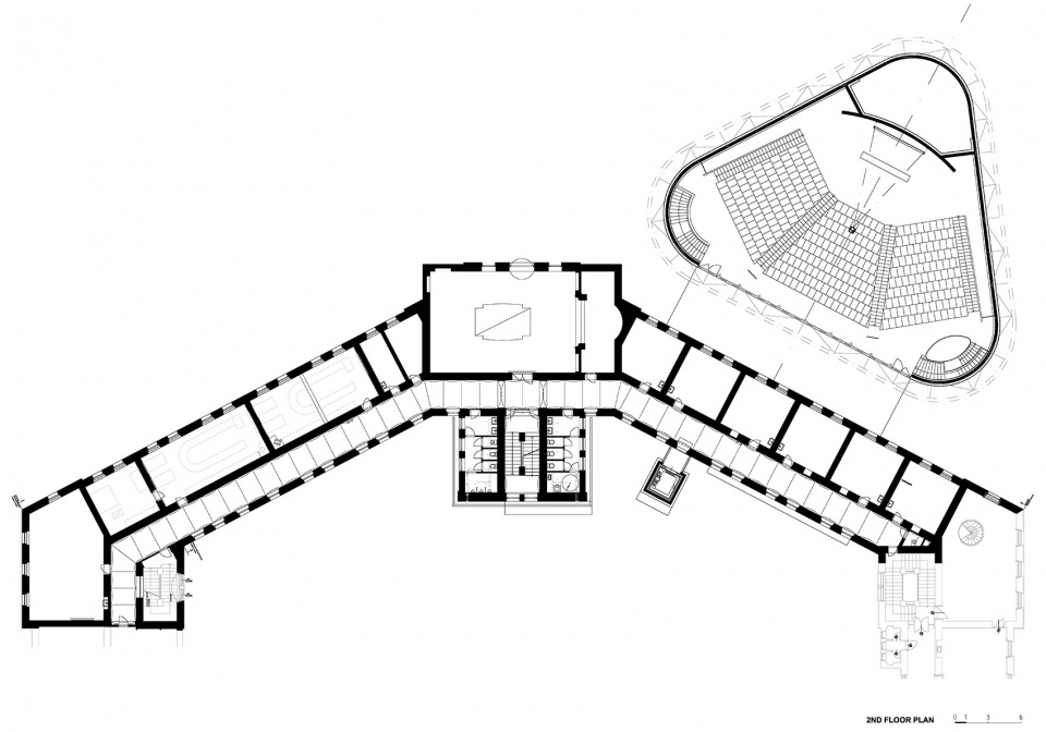 The wing reconstruction area and the new lecture room VŠPJ (College of Polytechnics) is a modern concept of rapidly developing education center located in northeastern corner of the lot. The place of the new building is strictly symmetrical, markedly triangular, thus for a construction seemingly disadvantageous. The authors from the studio Qarta architektura changed the disadvantage to an advantage by using the shape and by a link up to the existing block they gained compact space for a large span construction.