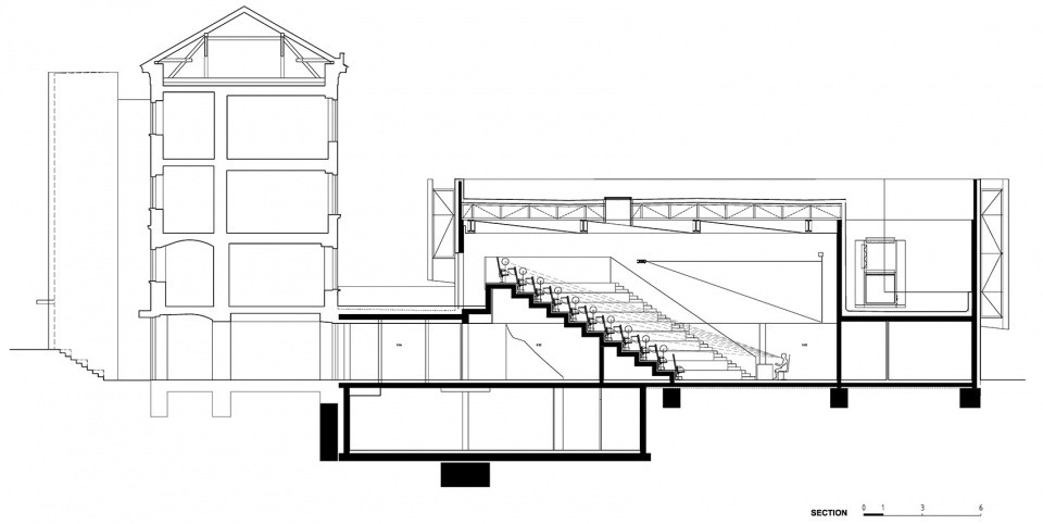 转角的圆润有助于将体量融入复杂的环境中,偏移的立面创造出一个过渡的空间,成为了新建筑的另一大特色。挑高的大厅内有333个圆形剧场式学生座椅,陡峭的看台为场馆提供了良好的可视性和纯粹的音响效果。中庭有地下通道,地下空间将被用于社交活动。连通的演讲厅通向高等教育的经典元素“炼金工场”,也就是如今被称为“虚拟工厂”的多媒体实验室。