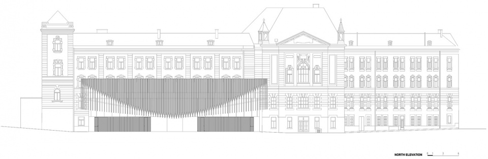 Roundness of the corner contributes to integration of a mass into a complex context; the offset façade is another trace of a new shape, creating a transition space. Inside a super elevated hall is amphitheatrical seating for 333 students. Thanks to the steepness of the stands the arena offers excellent visibility as well as pure acoustics. Tribunes have underpass, the space under them will be used for social events. Connecting presentation hall leads to a classical element of higher education “alchemistic workshop”, represented today by multimedia laboratory “virtual factory”.