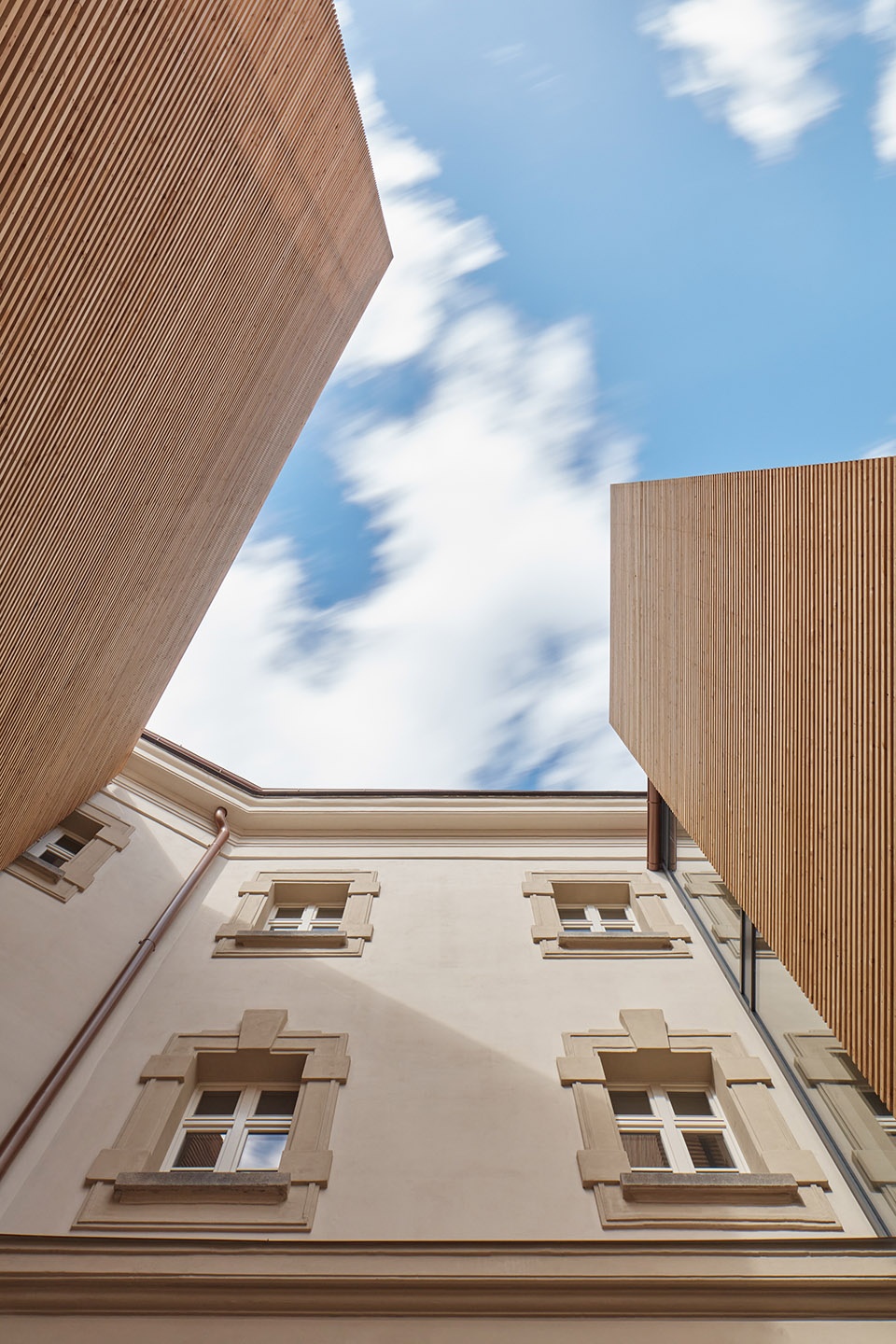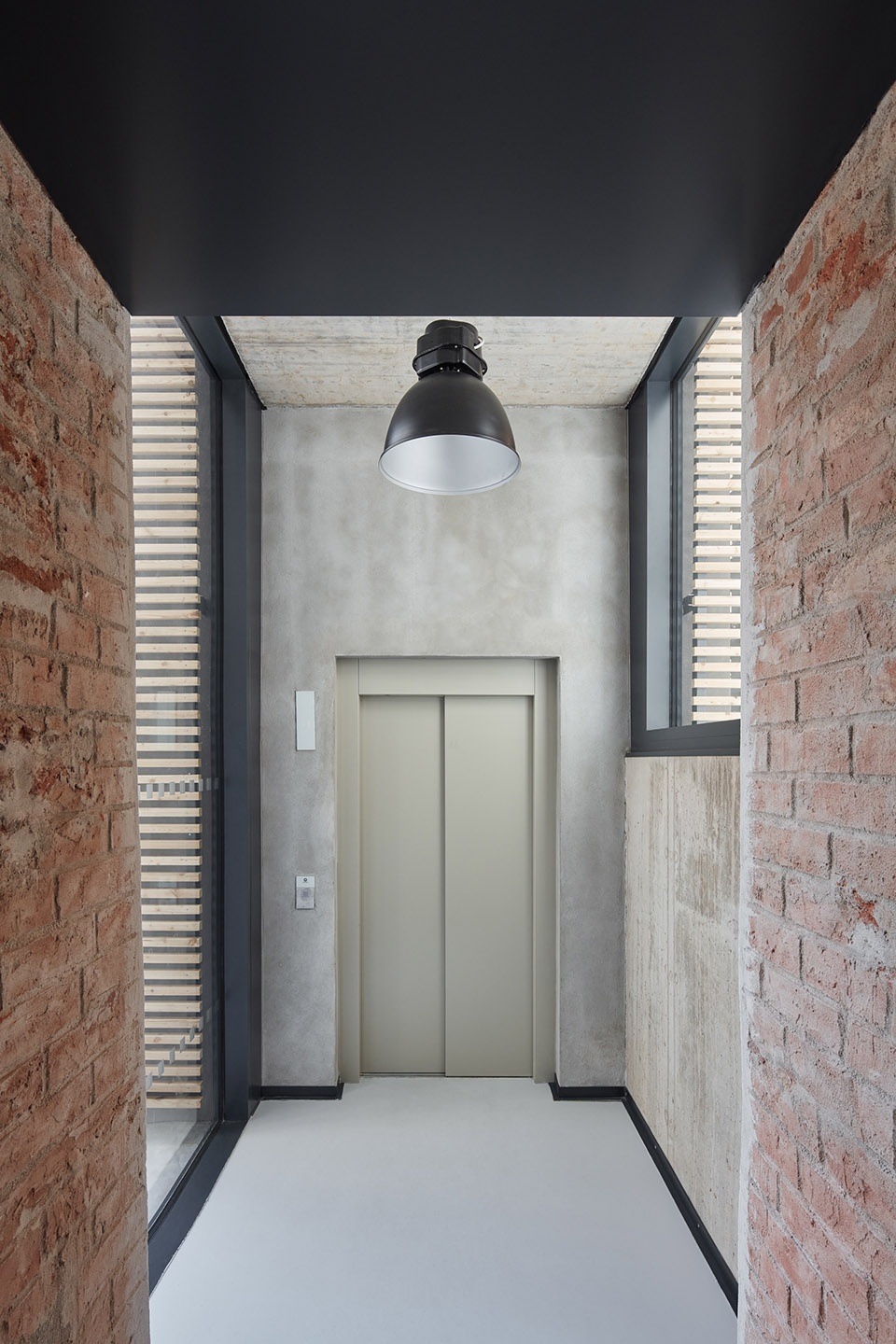 In contrast to the auditorium is a reconstruction of the original part of the historical pentagon, which was formally a court with a prison. Strictness, firm order, rigidity and oppressive atmosphere were clearly evident at the beginning of the undertaking and the authors were fully aware, that the premises will newly serve young people with open mind on their way to higher education. The motto became a colorful, inspiring and non-conforming environment, preserving the historical footprint. The traditional materials are in a visible, original form; the industrial character is fully linked to the auditorium. A sole chapter was the discovery and the engagement of historical footprints, return of the original ceramic floor or stone sills with traces of bars, which make for a great experience in the interior.