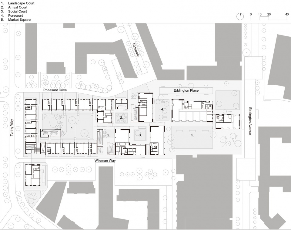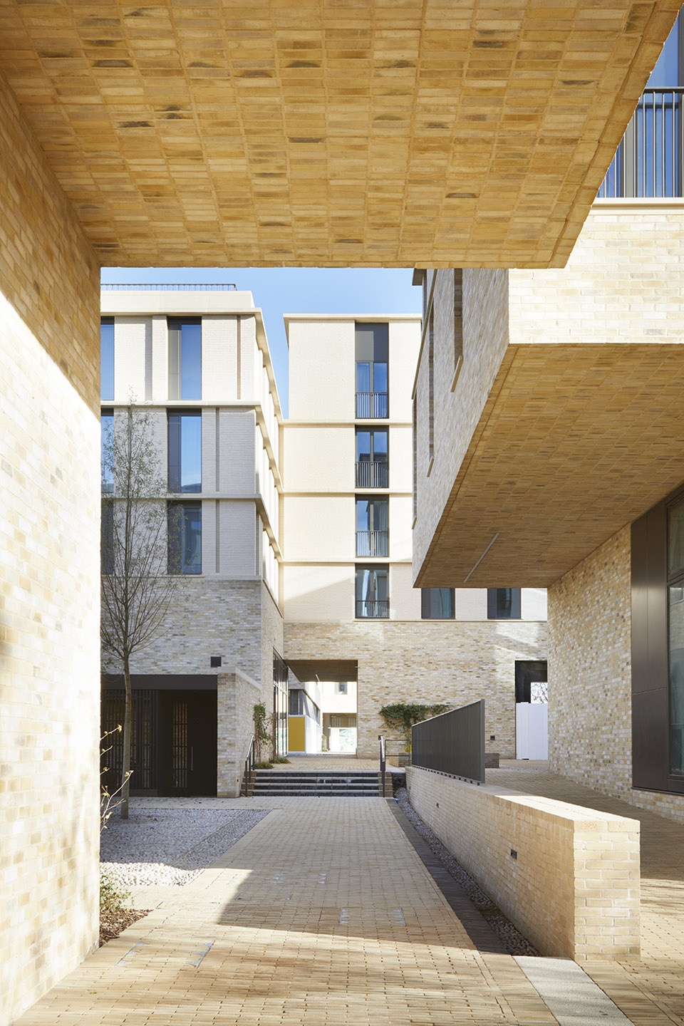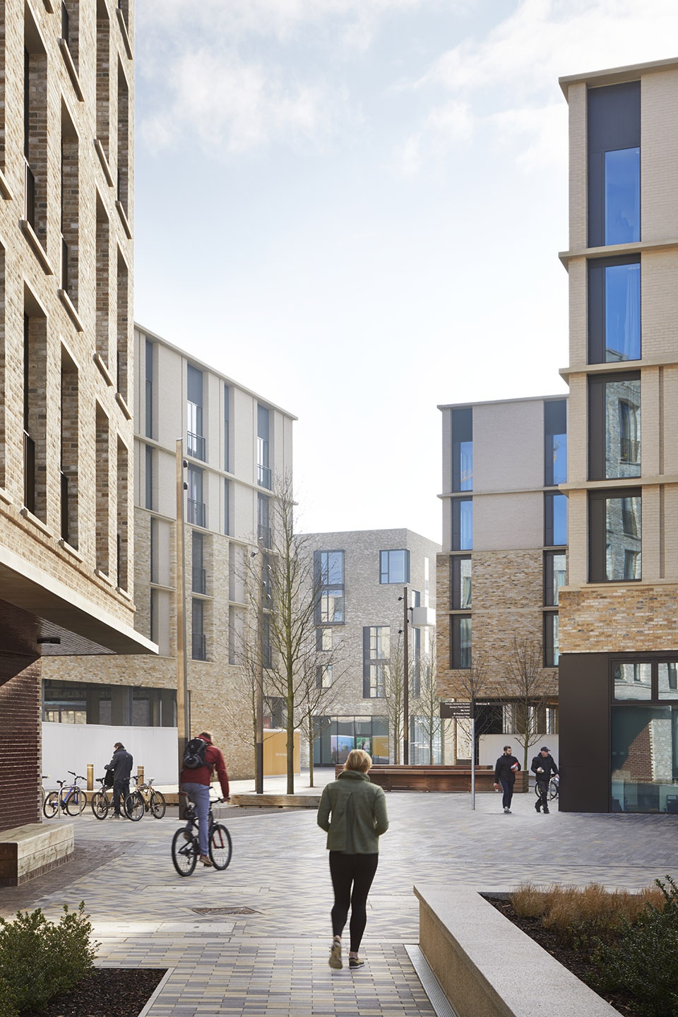 Placing a firm focus on fostering communal life, the spaces between buildings are as important as the buildings themselves. A network of courts and squares creates a transition from the life of the city into the heart of a new community. These varied interconnected spaces form a social landscape, recalling the differentiated spaces of the traditional city and the historic collegiate spaces of central Cambridge. They differ in scale and function, moving from the large, urban and public Market Square, through to the semi-public Landscape Court. Further courts and passages mediate between the two, providing a more intimate scale, communal facilities and semi-public functions.