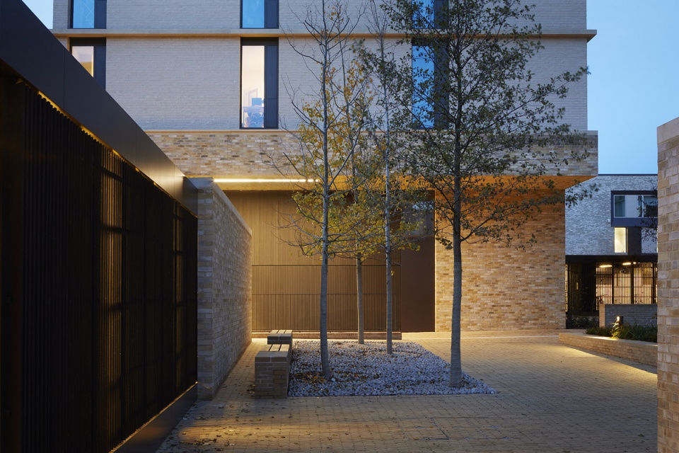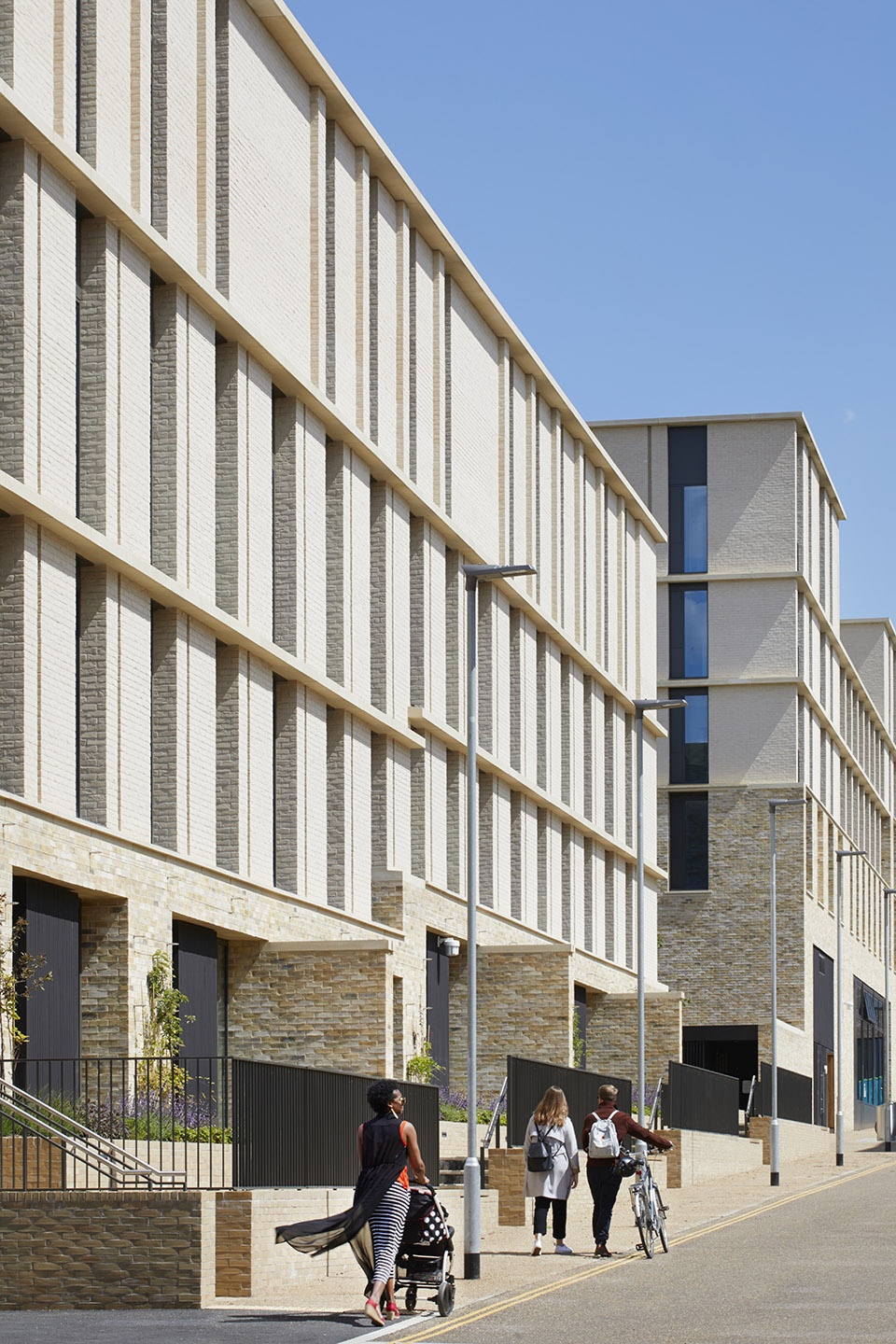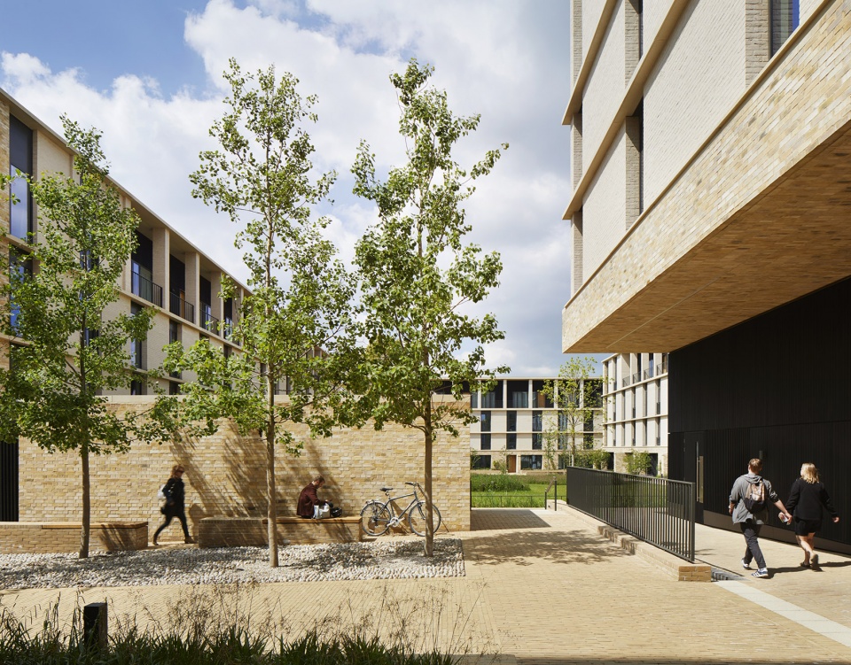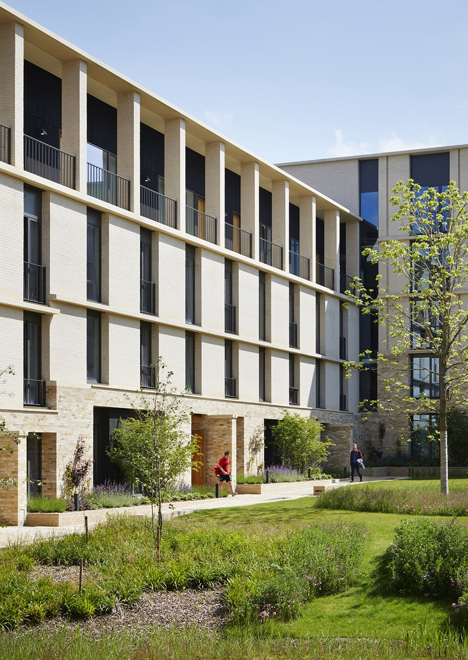 The palette of natural materials references the materiality found in the domestic architecture of Cambridge. Brickwork and traditional cobblestones provide continuity and a sense of permanence, while timber and natural elements such as plants and water features introduce detail on a more intimate scale.Building forms are strongly articulated and details vary to respond to their prominence within the surrounding context. At ground level this expresses itself as a brick plinth connected visually with the materials and activities within the landscape. Above this level the building forms are strongly articulated through the use of recessed brick piers and horizontal precast cills.