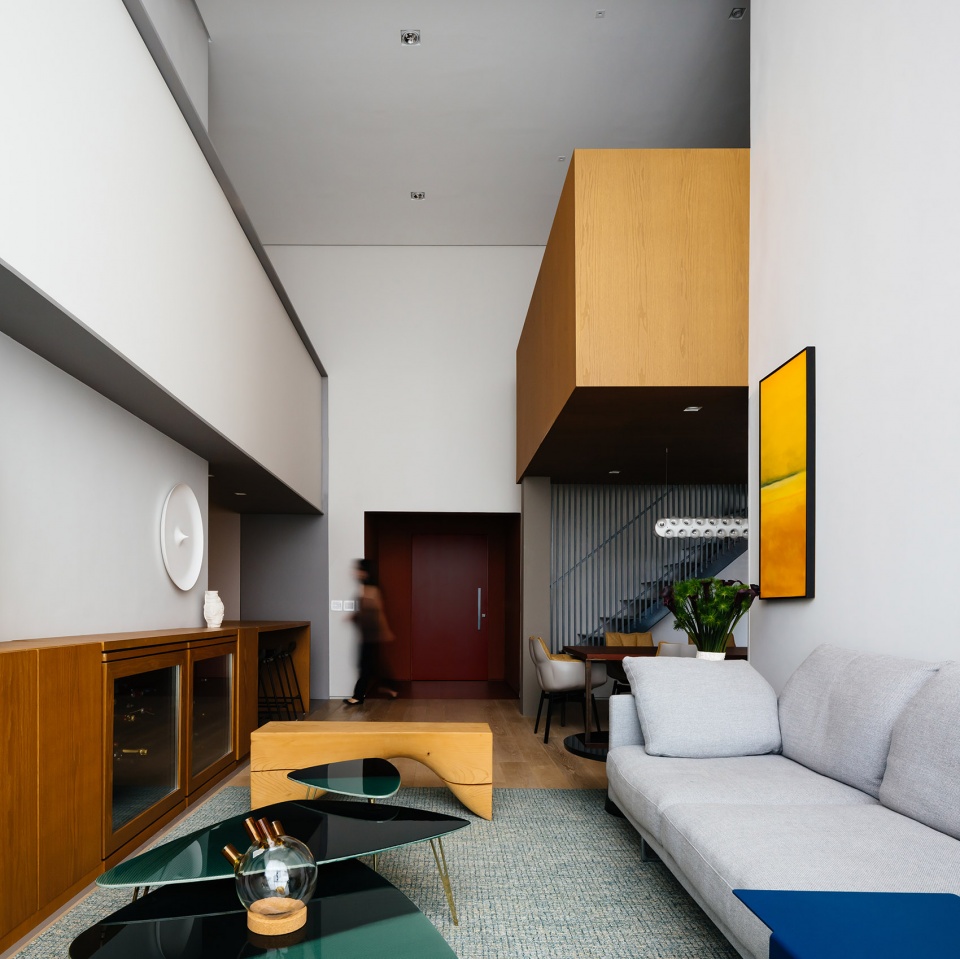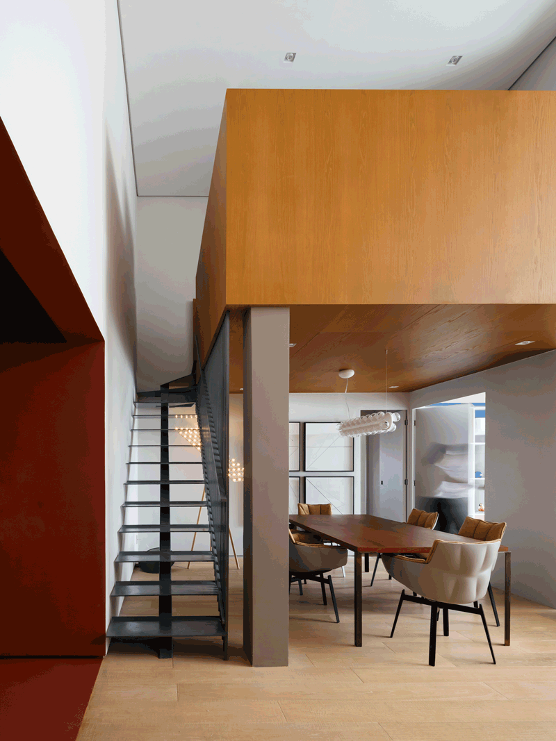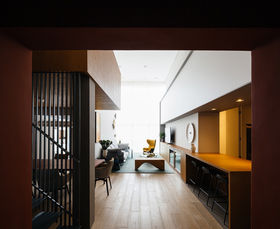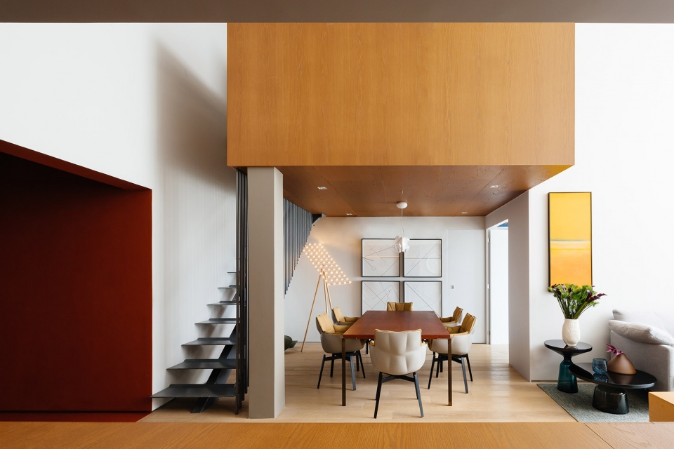 公寓的主人是一对夫妇和他们的两个女儿,他们曾经在荷兰生活了8年的时间,因而设计师在创作过程中引用了许多荷兰的文化和设计元素,以增加家庭成员对其新住所的认同感。此外,设计师还根据每个人的实际需求对空间进行了分类,创造出套房、办公空间和游戏室等专属空间。用途相似的区域采用了相同的形式和色彩,在双层高的单体空间中形成四个功能性的“盒子”。
