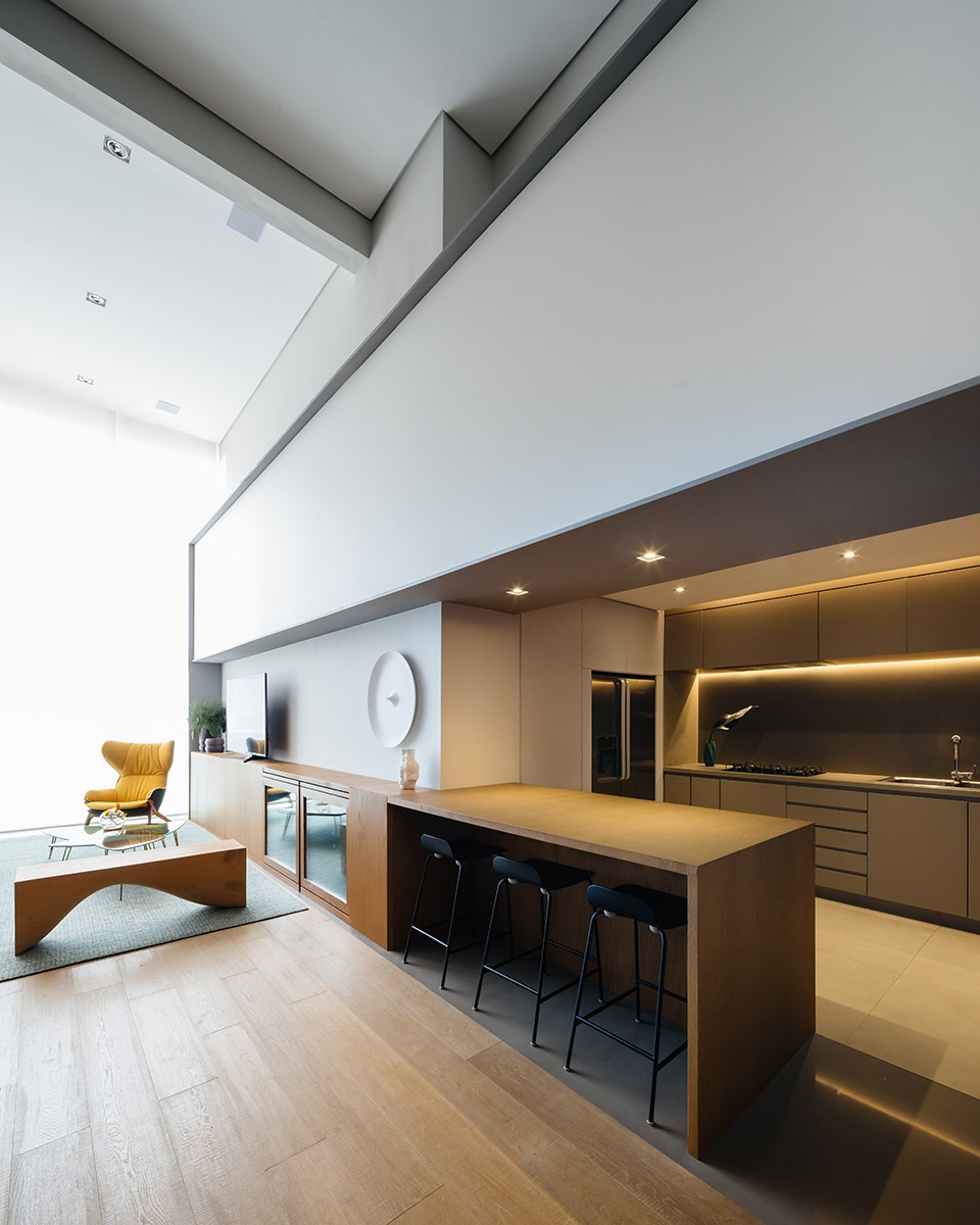 The second box consists of the table that separates the kitchen from the living room, a large piece of furniture that received tensoflex as a lighting device that simulates the sunrise and sunset light, through the dimming of the LEDs. Through this warm and changeable light, we managed to change the atmosphere of the apartment’s integrated and single space.
