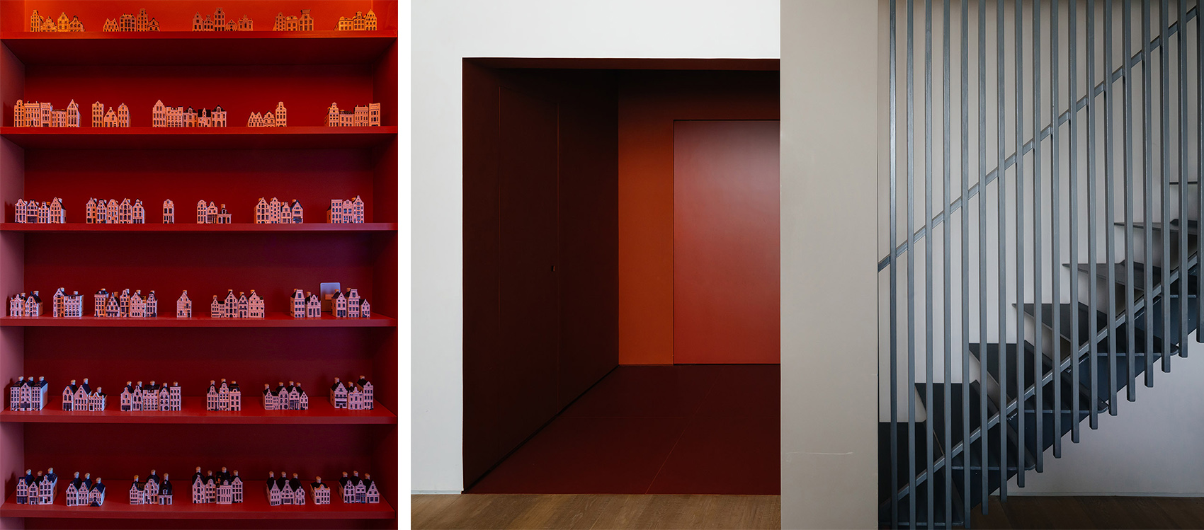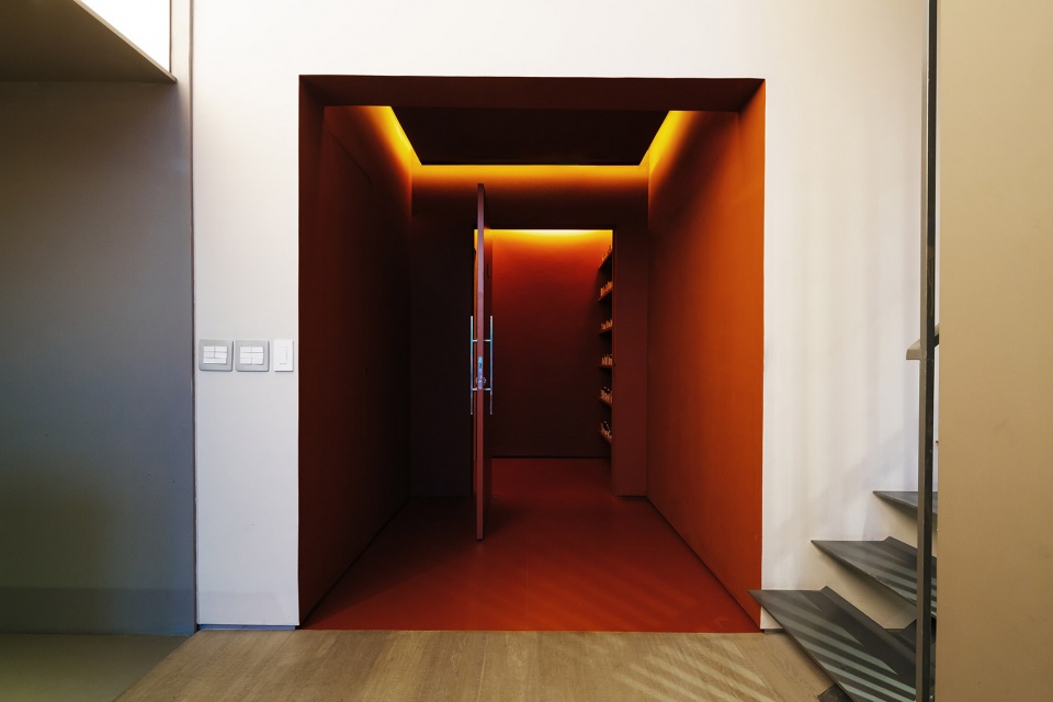 第一个盒子包括入口门厅和通往洗手间的走廊,是连接公寓内部和外部的过渡区域,并通过红宝石色突显出来。入口处陈列着夫妇二人收藏的荷兰工艺品,使人在进入房间的一刻便与温馨的家庭记忆形成关联。