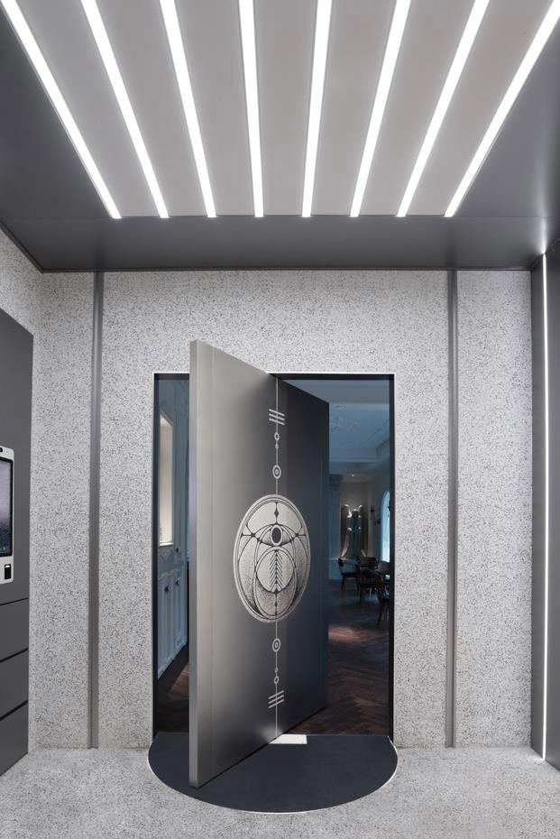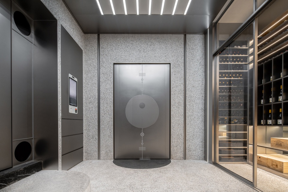 隐形旋转门作为外建筑和内空间的承启,书写了 | NOVVINE | 的序章。第一空间运用了定制不锈钢喷砂板和水洗石,线性灯光更加烘托出了材质的肌理。我们运用古典元素和现代元素的视觉冲击来给予客人时空穿梭感。
