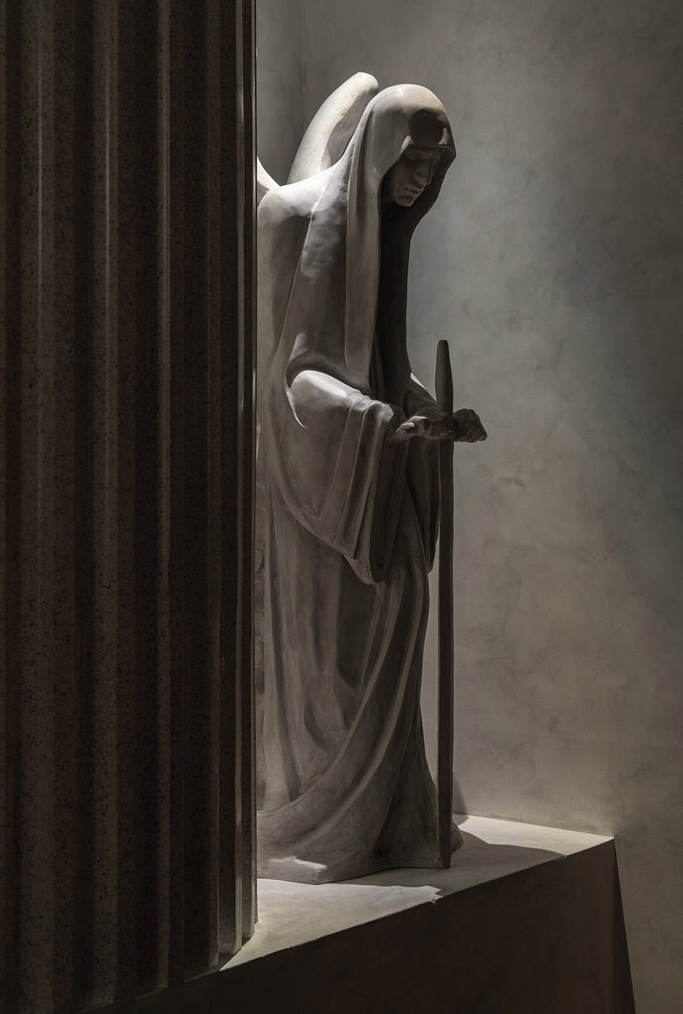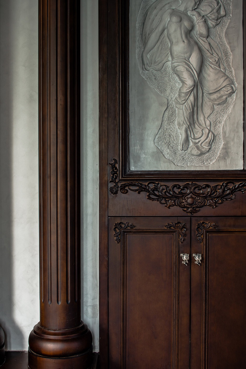 在红酒体验的空间,我们没有将原有的墙面封裹,窗外的府河河景赋予整个空间更靓丽的风景。光是塑造物象的媒介与手段;是空间色彩变化的铸造者。浮雕和雕塑在光的塑造下形成显著的明暗、虚实对比。通常我们总是希望创造空间的叙事性,而这个空间本身就可以带给我们叙事感。尝试不同的叙事方式,给与客人一个场景切换的可能性,看到人们在整个空间度过一段饱含情感的重要时光,也达成了我们设计时最本真的愿望。