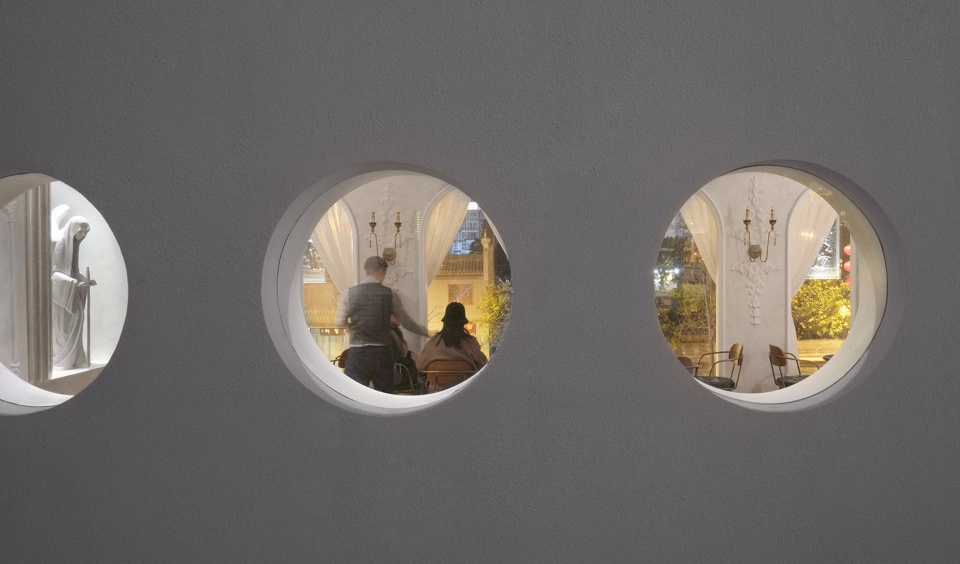 ▼从里面圆形窗洞看向室内,view to the interior from the circular openings on the facade ©形在空间摄影