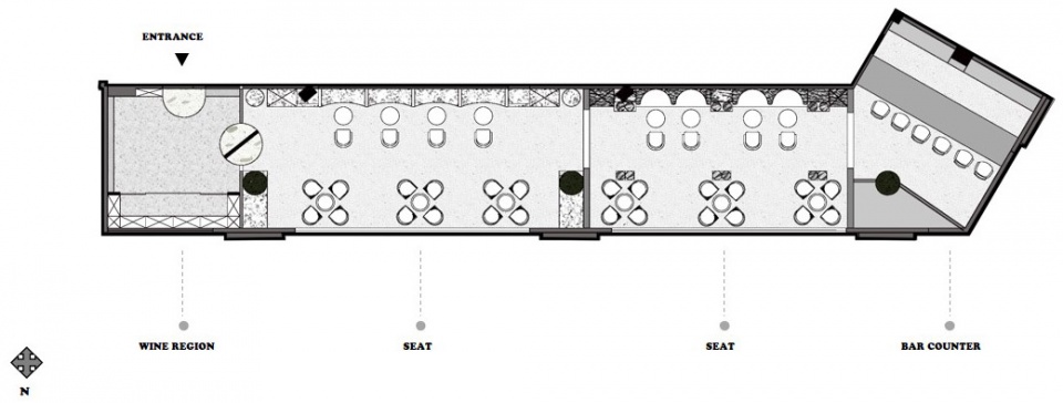 NOVVINE位于成都香格里拉酒店楼下,是一家专业的Wine Bar。当狭长的空间平面在我们面前展开时,我们首先考虑的是如何对纵深的空间加以利用并使之成为该亮点。法国艺术和法国红酒一样细腻、醇厚。空间设计的灵感源自凡尔赛宫的战争画廊:鲜血在铁与火的交织中铸就时代前进的脚步,艺术画作中凝结了时间的流逝。简洁几何形的设计外观。纯粹的白色外墙让源自内在的质感得以释放,舍弃各种表面装饰,运用简洁干净有肌理细节的白色涂料将外墙包覆让整个建筑更具独立性。