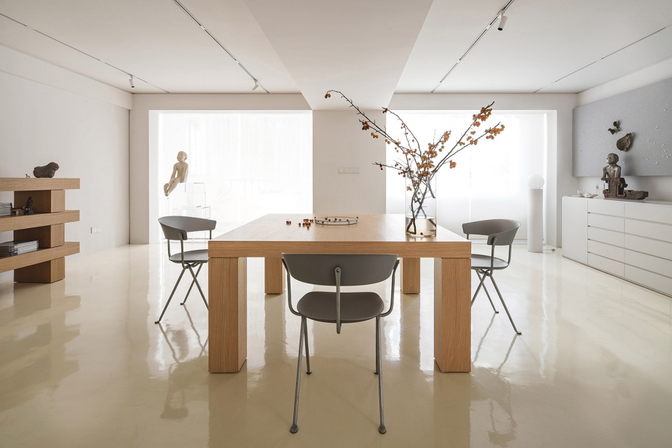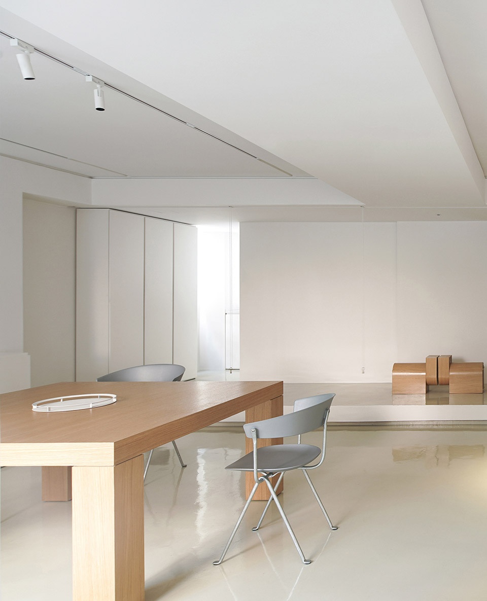 Through control of the spatial proportions and the absolute submission to and grasp of natural light (a vital material), the designer has provided the studio with an immersive atmosphere in which people and objects are homogenized. People and objects have their own place, and there is no principal-subordinate relationship between the two. Objects seem to adopt a fresh and new look every day, and people have a greater awareness of the objects in the space.