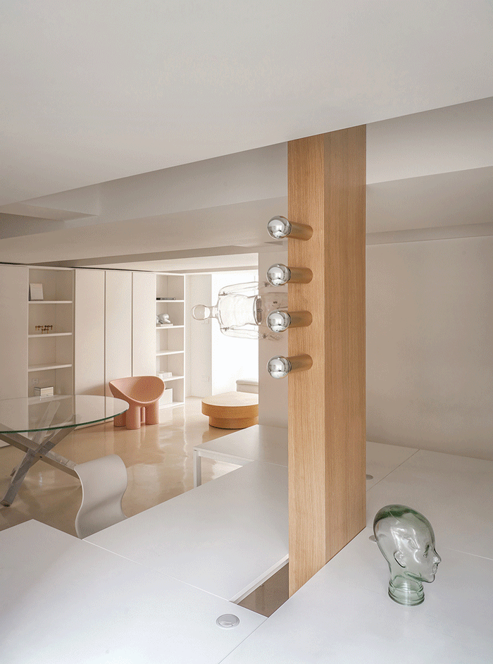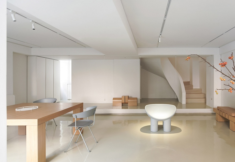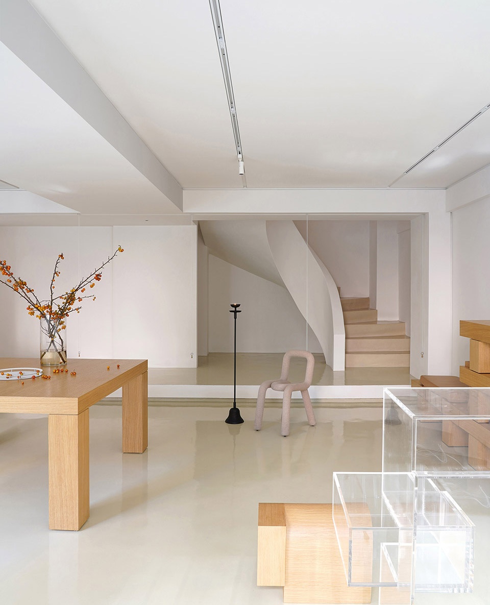 The first floor is a multifunctional space that covers reception, product research, and an art gallery. There are obvious differences in the space of the two floors of the studio. The first floor tends to be classical and symmetrical in terms of its spatial dimensions. Space acts as the background to all else, and a clean framework and objectivity are required to support all possible changes to the display in the future. This is crucial for designers.
