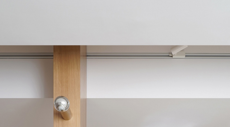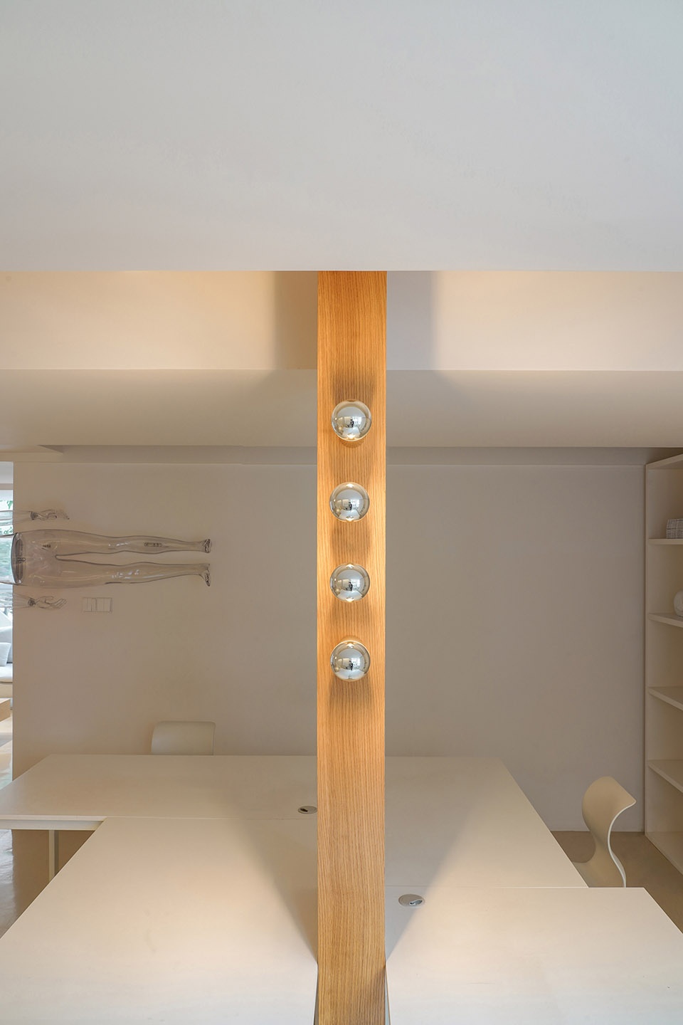 The oak lighting pillar is not simply defined by its shape. In fact, the computer equipment rely on it to obtain power from the ceiling. The designer has also added a set of pure copper wall lamps at equal spacing on the side, aiming to disguise its true purpose as a utility pillar.Surrounded by worktables, the lighting pillar pierces the sections of ceiling. Its positioning is related to the plane line. The designer hopes to create a circuitous line around the working area within the limited space available, so as to facilitate the interaction between workers.