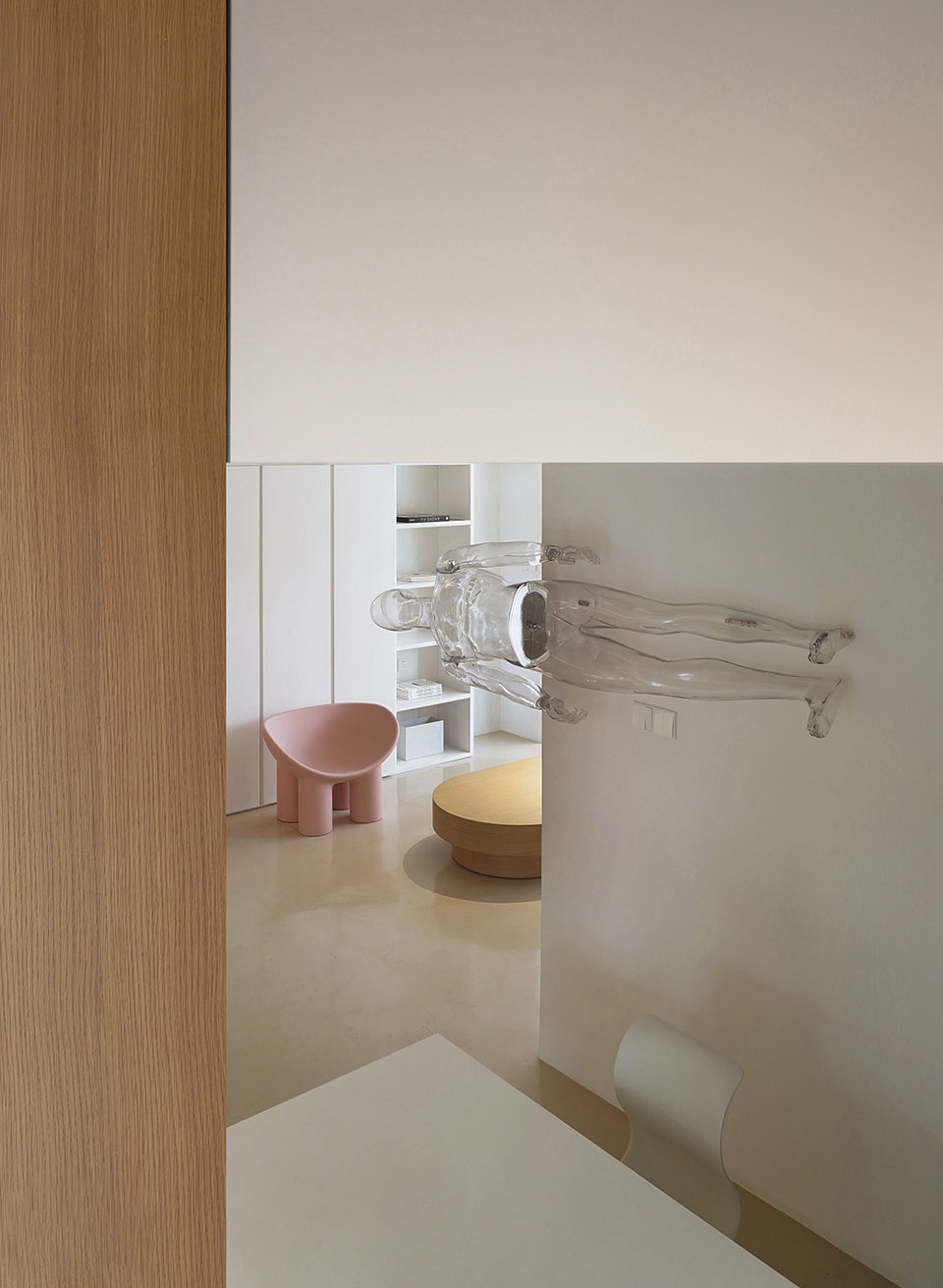 墙体转角位置挂着一个透明人装置,部分身体悬在空中,与阵列天花造型平行:一是强调空间的水平方向上的拉升感;其次如设计者所愿,它在“游戏”空间重力的同时,带来了一些趣味性与艺术性。