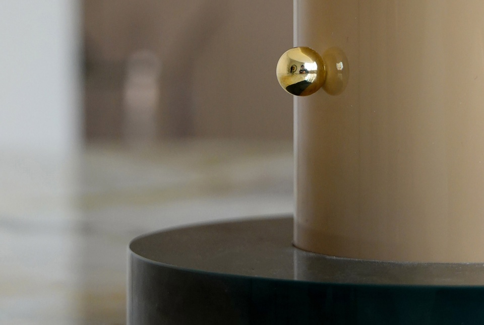 橡木材质的灯柱,其设置的出发点并非在其造型语言本身,电脑设备的运作其实是靠它从天花接下来的电,设计者顺势在柱体上增加一组等间距的纯铜壁灯,用装置感去模糊柱体作为“电线杆”的实际身份。被工作台围绕的装置灯柱穿插到天花阵列形体之中,它的定位与平面动线有关,设计者希望在有限的空间尺度里制造一个围绕工作区的迂回动线,方便伙伴们之间的互动。