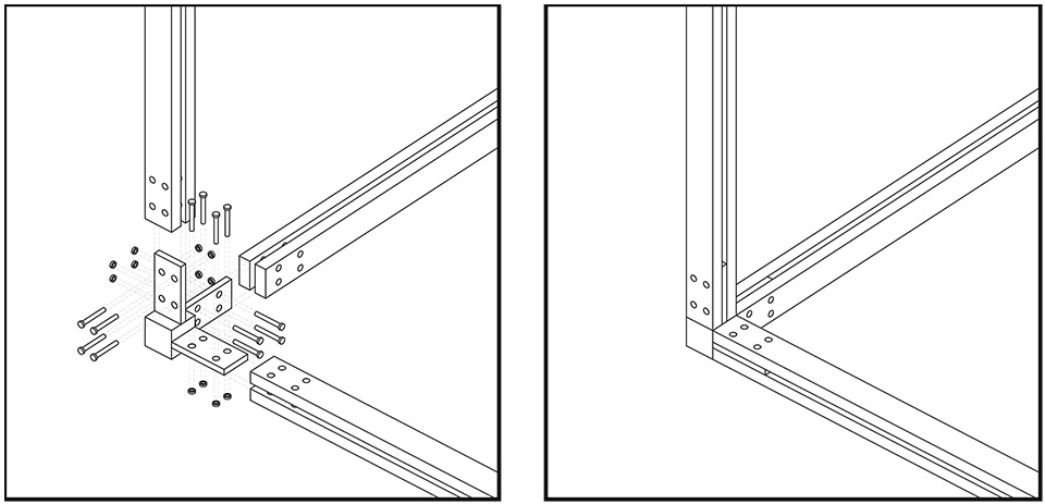 每年参加茶山行的茶友人数是变量,从20人到40人不等,茶亭需要灵活变通以满足不同人数的需求。在装置制作完成之后,我们得到通知这次茶山行的茶友人数是39人。为了方便任何人在图示说明下就可以搭建和拆除,我们设计了一个简单直接的黄铜三通构件与橡木连接,只需一个内六角扳手,一个人也可以完成整个拆装过程。