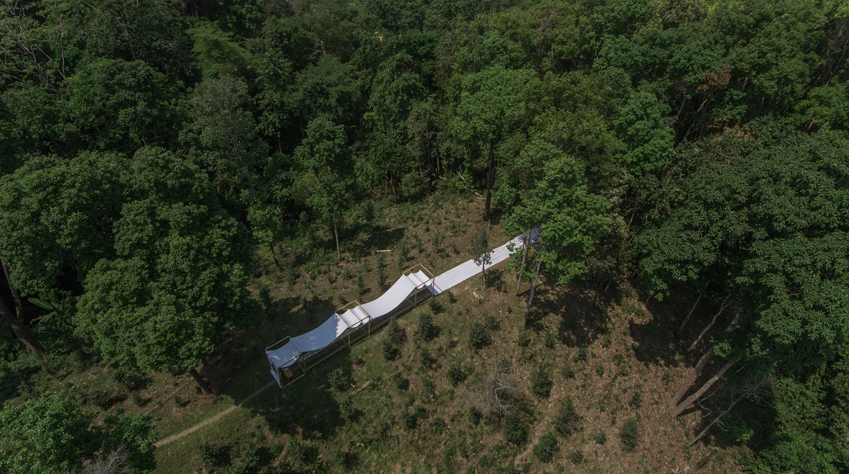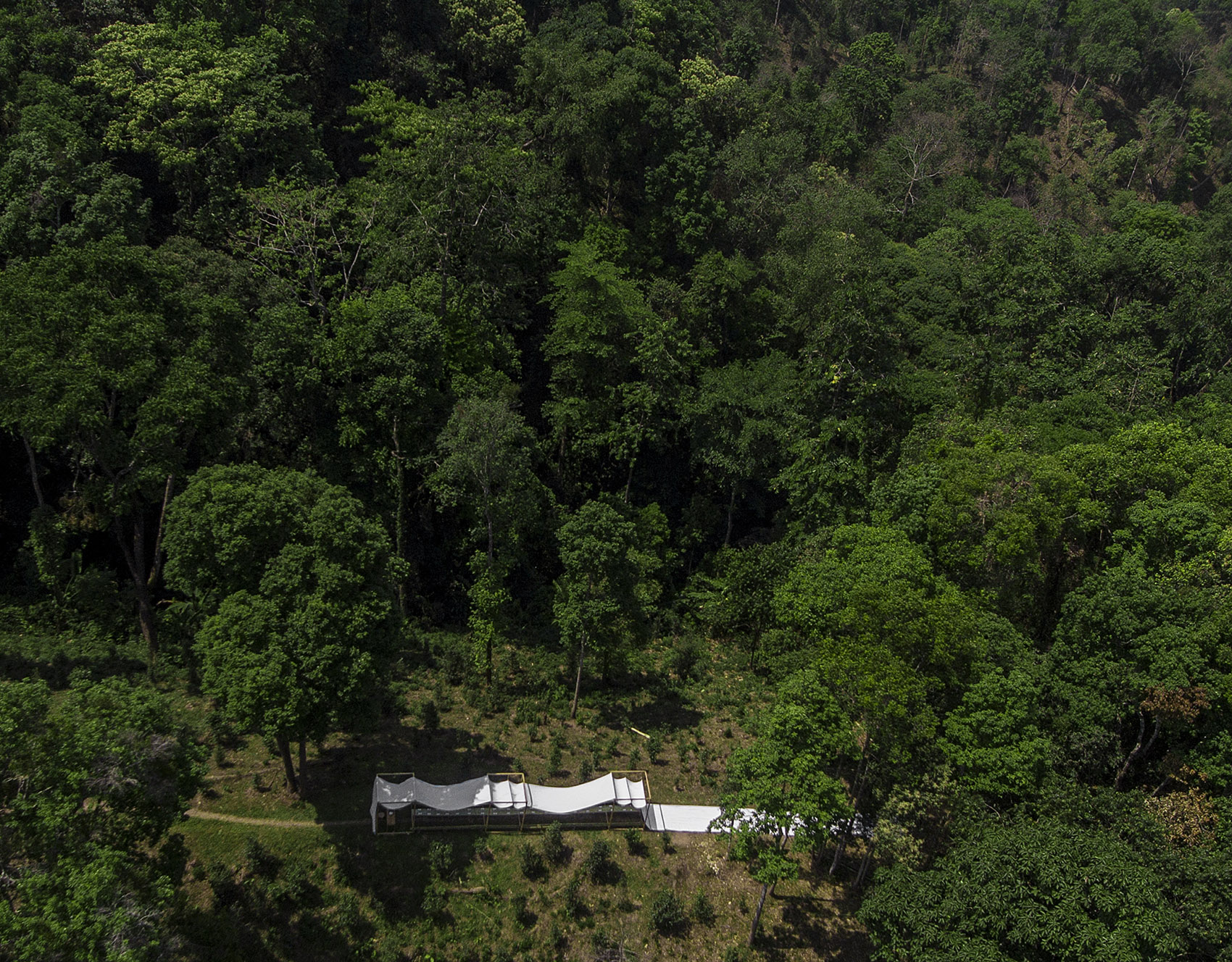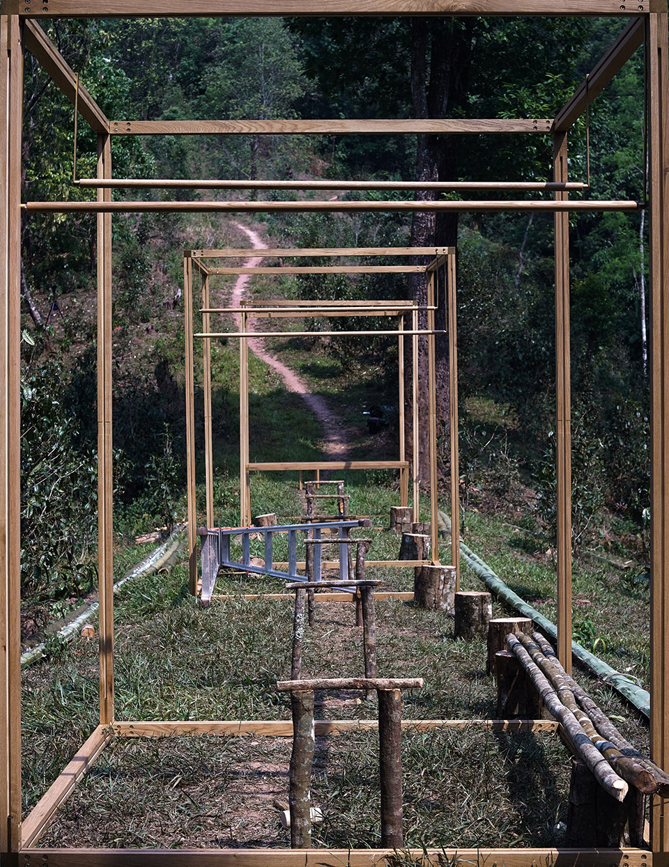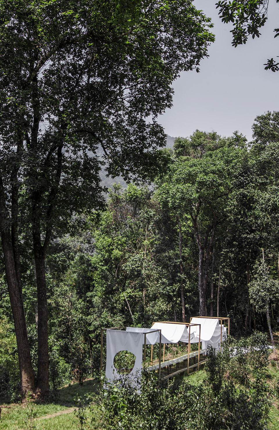 The location of the tea pavilion is on a ridge of Yibang tea mountain, the northernmost part of Mengla County, Xishuangbanna Dai Autonomous Prefecture, Yunnan Province. The mountain ridge is said to be a section the Ancient Tea Horse Road. It reaches deep into jungle, surrounded by dense tea plants. Besides fulfilling the pavilion’s intended purpose, we made use of the “line” element of the tea brand image to present a “line” on the mountain ridge, which not only infused a sense of ritual into the design but echoed the brand image.