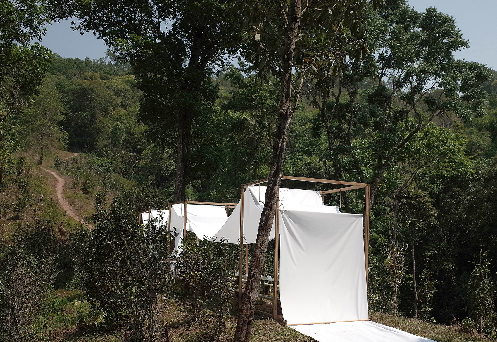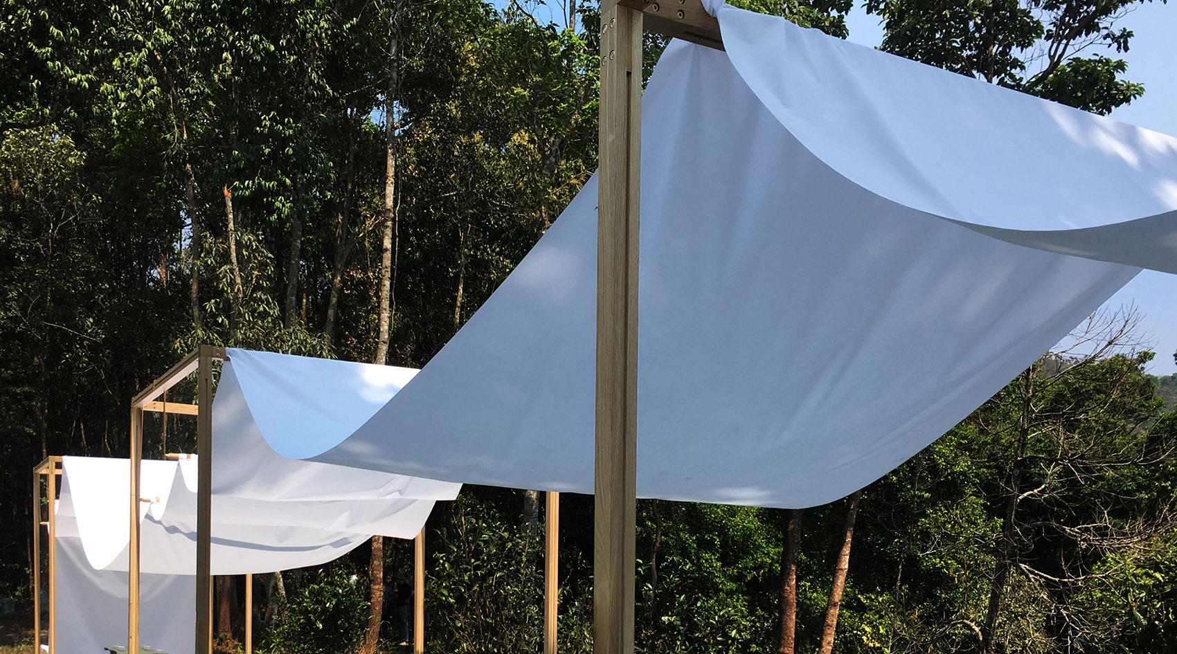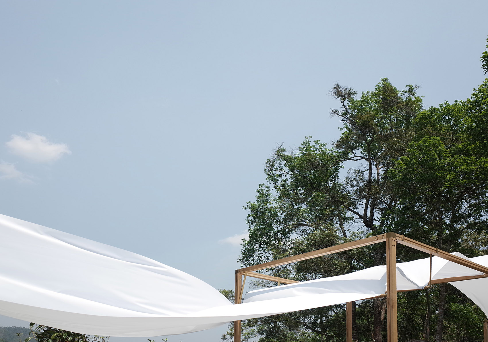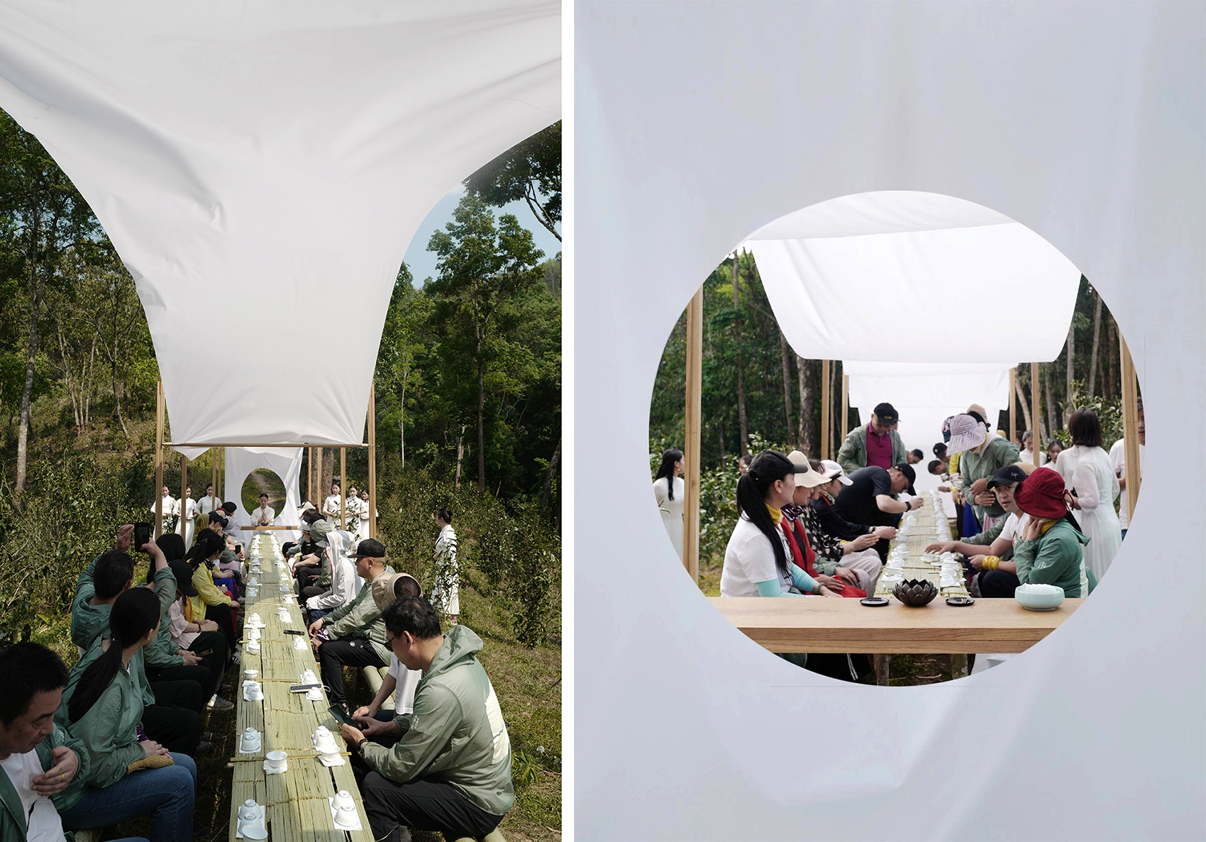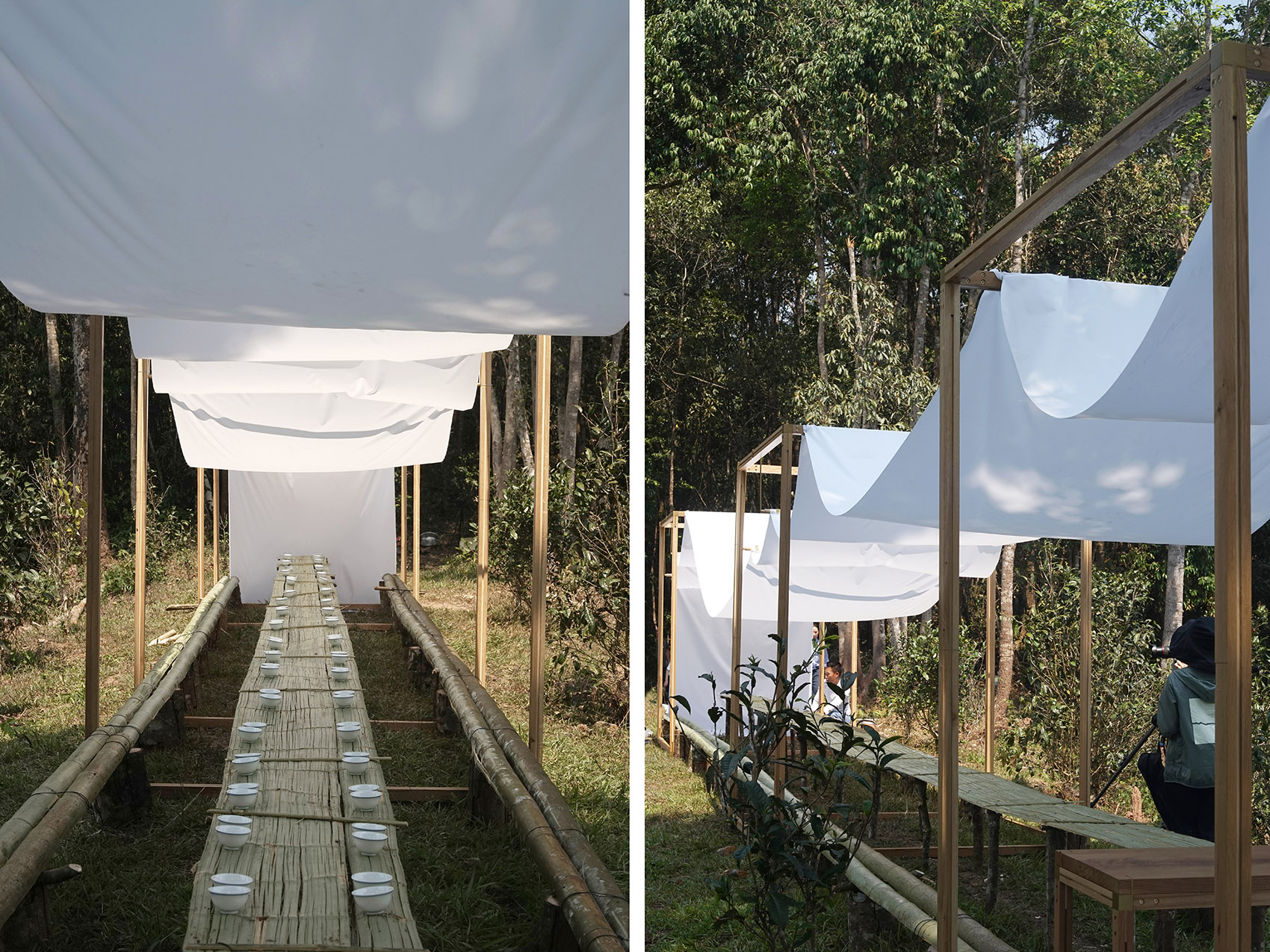 亼建筑在某茶叶品牌形象整合设计团队SMiTH(Beijing)的委托下为户外茶山行活动设计一个茶亭装置,需要满足20到40个茶友在户外喝茶以及观看茶艺表演一天的需求,并且方便搭建和拆除,拆除的构件可以在第二年茶山行活动继续使用。茶亭构件都在北京制作完成后运输到现场进行组装。