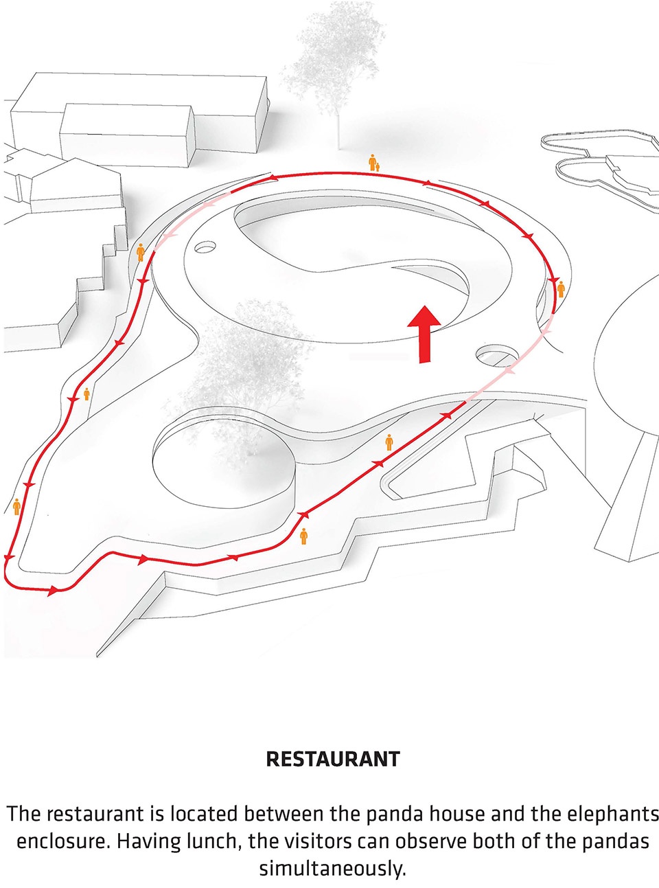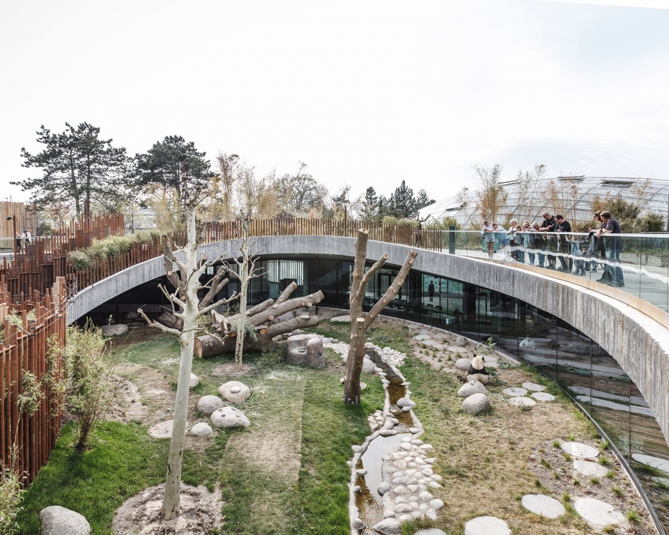 参观路径沿着环形的围墙逐渐下降,人们可以在这个过程中深入地了解动物园职工、兽医和园艺师的工作。熊猫馆分为两个楼层:一层是融合了法国和亚洲风格的PanPan小餐厅,客人们可以一边用餐一边观察熊猫和大象;二层是充满北欧植物的花园,此外还有一条通往茂密竹林的小路。