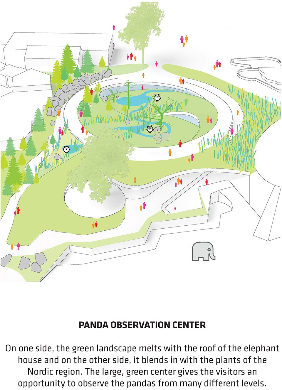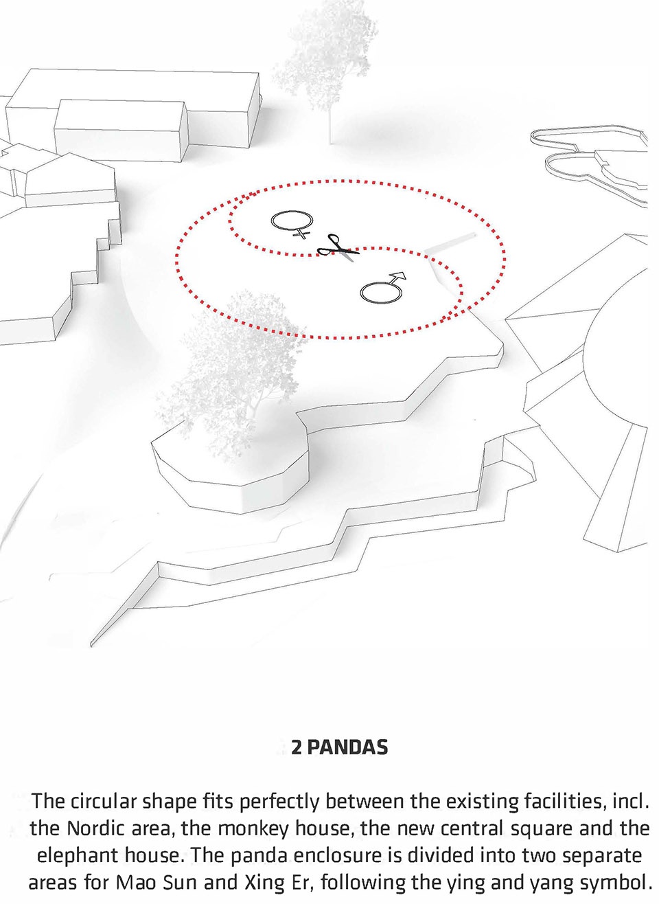 熊猫馆整体被自然环境包围,毗邻动物园的中央广场、北欧馆、猴子屋和大象馆。毛笋和星二的圆形小屋被分成两个部分,其形式呼应了“阴”和“阳”的符号,旨在为它们的日常生活和彼此之间的关系创造最自由、最自然的环境。