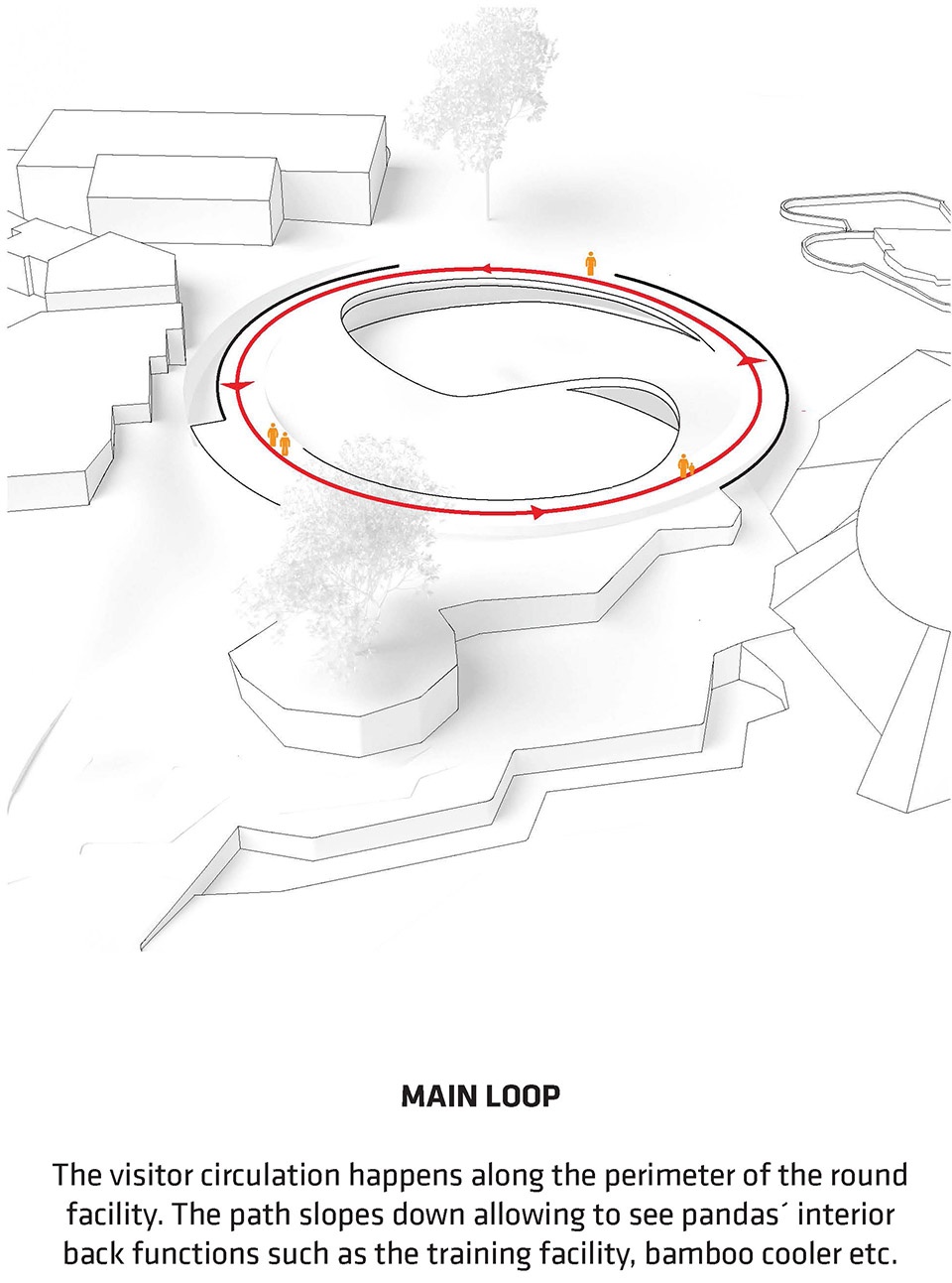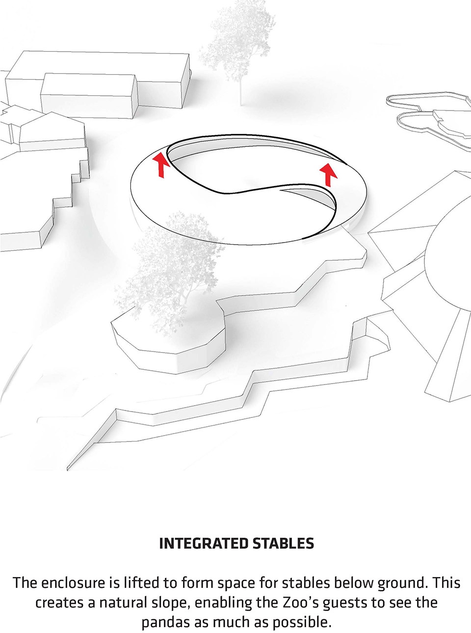 Both pandas and guests hardly notice the separation; the enclosure is elevated to form stables and other facilities below ground, which simultaneously hides and integrates them into the landscape. By lifting the earth at both ends of the yin and yang symbol, an undulating landscape forms to allow direct views into the pandas’ habitat.