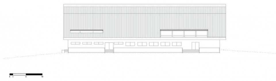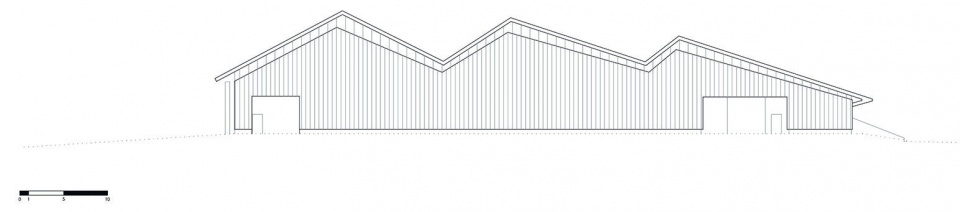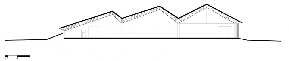 市政当局规定屋顶必须带有不小于18°的坡度,这对于如此大规模的空间布局来说是一个不小的挑战。因为那意味着建筑物必须尽可能地打造得高,并且需要一个巨大的空间来保持良好的通风。于是,团队决定将屋顶具体化为折叠的金属板,并赋予其可活动的概念。为了强化这一概念,并尝试将屋顶与主要的建筑体量分开,团队采用了一块宽大的、可透光的半透明板材。在东面,通道分为两层,分别是行政区域、各种活动室、衣柜、厨房和餐厅,以及其他辅助项目。交替折叠的屋顶,让自然光可以照到较高的平面。